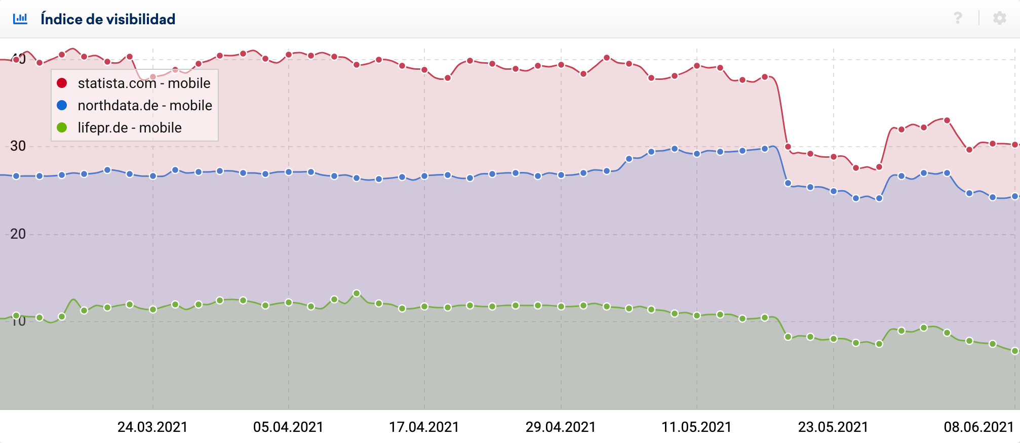 Son tres dominios alemanes (statista.com, northdata.de y lifepr.de), pero sus movimientos durante el mes de mayo nos sirven para entender estos pequeños cambios del algoritmo. Los 3 ofrecen contenidos de la misma tipología, contenidos que no son exclusivos y se pueden encontrar en otros dominios.