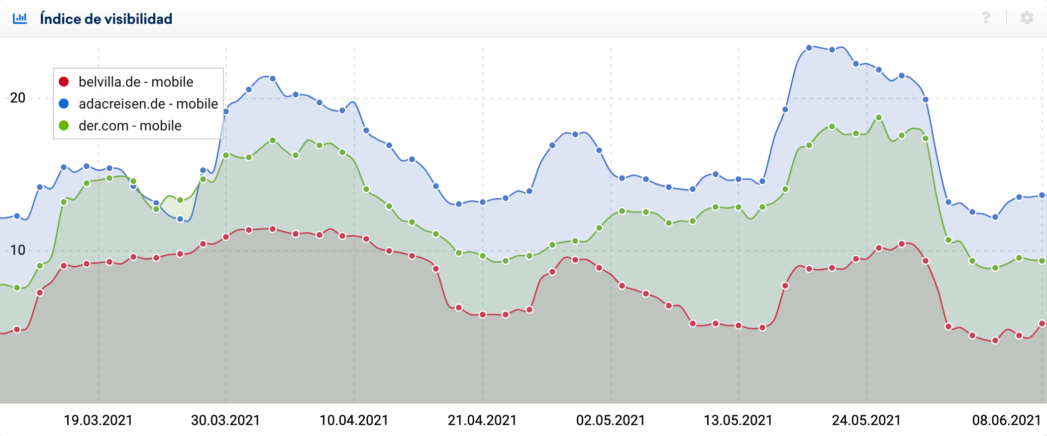 El desarrollo de la curva de visibilidad de estos tres dominios (belvilla.de, adacreisen.de y der.com) evoluciona prácticamente en paralelo. Estas variaciones están generadas en los resultados de búsqueda (cambios de algoritmo) y no por cambios en la demanda (volumen de búsqueda).