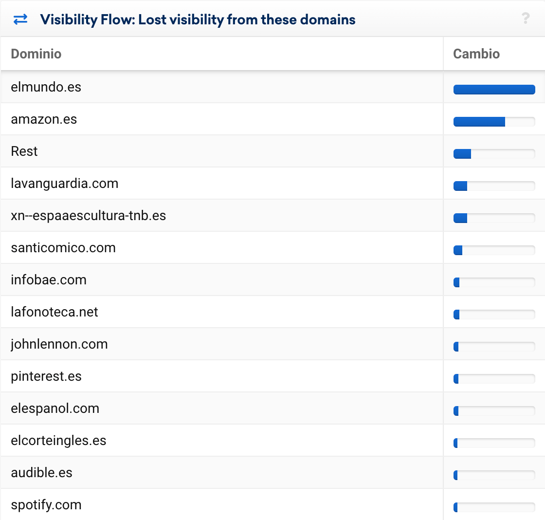 En el caso de todomusica.org podemos observar que sus competidores no ganaron visibilidad, sinó aquellos dominios que cubren la intención de búsqueda “Know”, como elmundo.es, lavanguardia.com o elespanol.com, así como ofertas de música como amazon.es o audible.es.