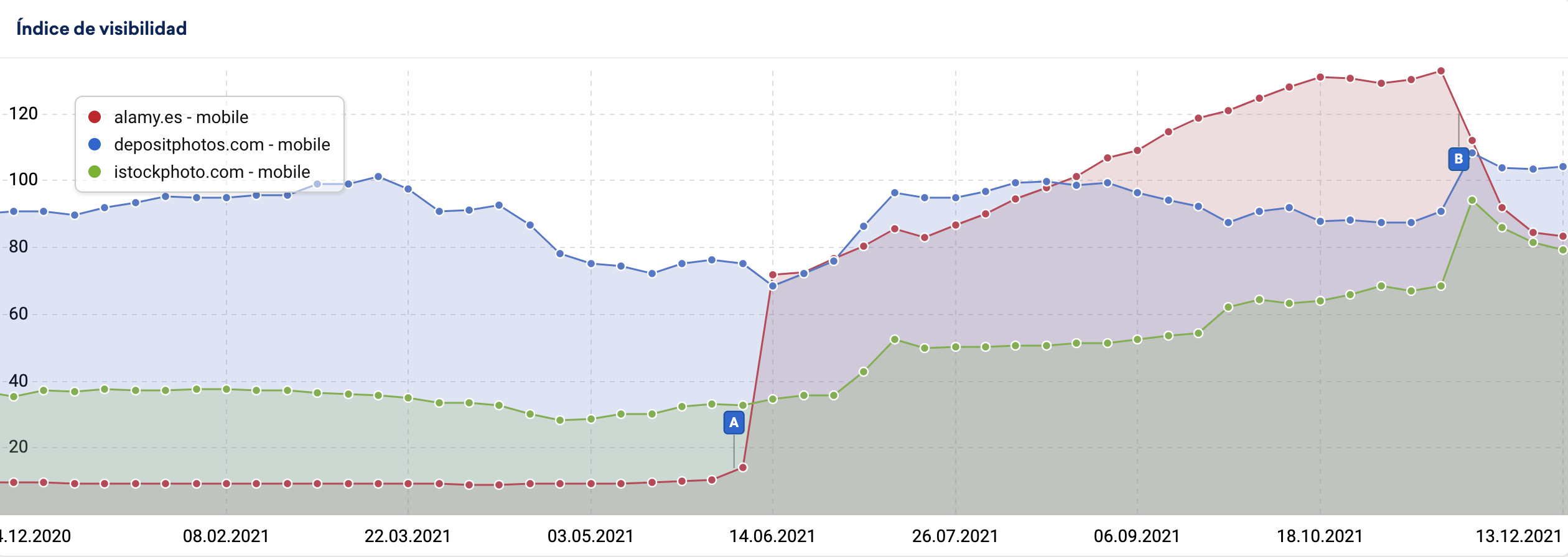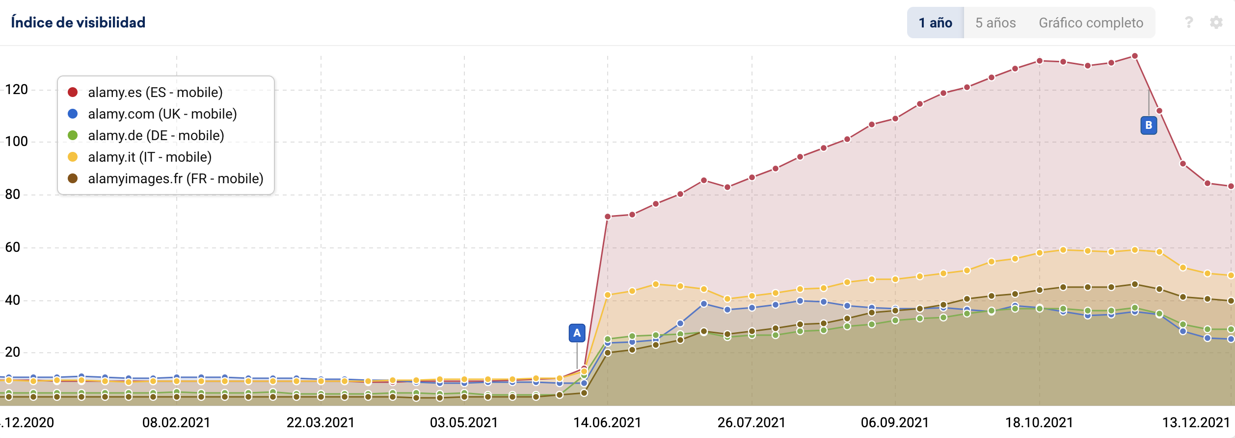 Alamy es claramente uno de los proyectos ganadores del año. Su crecimiento en todos los países es realmente espectacular. Y a pesar de la corrección en el Core Update de noviembre, sobre todo en España, los resultados son muy buenos, con una subida del 817% (77 puntos de visibilidad).