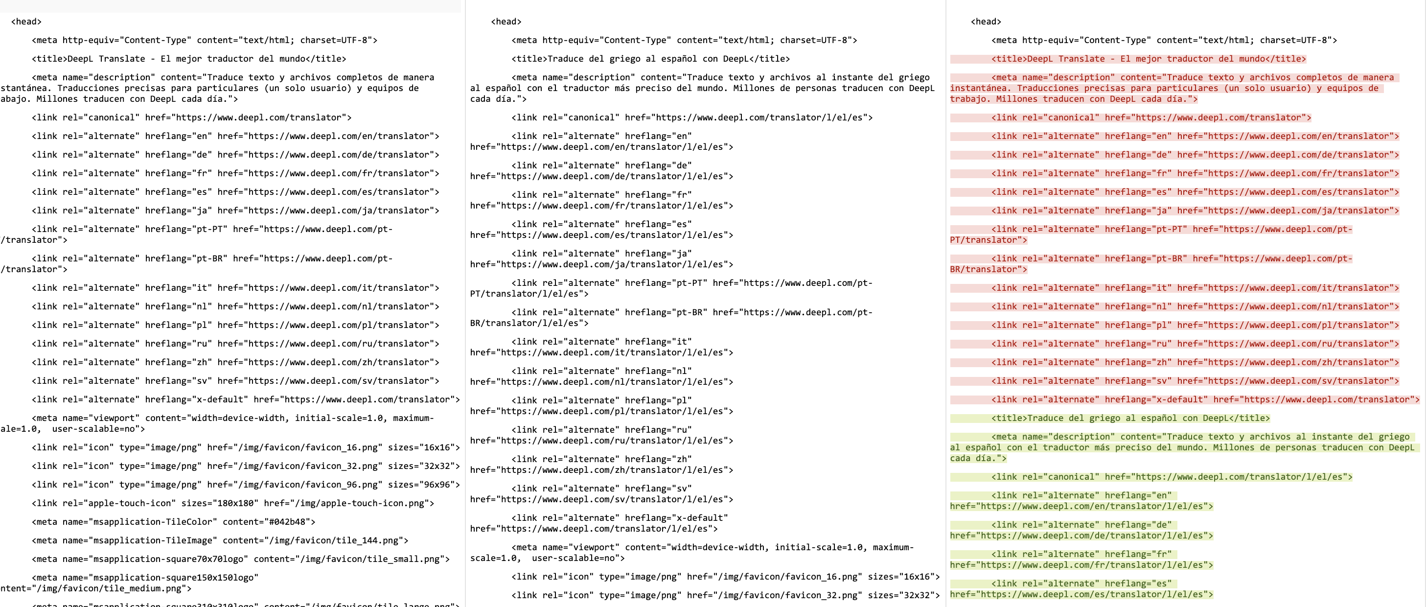 Si miráis esta página veréis que el HTML (izquierda) y el renderizado (centro) no es el mismo (diferencias a la derecha). No solo tiene “mejoras”, cambia partes importantes del DOM a nivel SEO como pueden ser el título, canonical, Hreflangs …