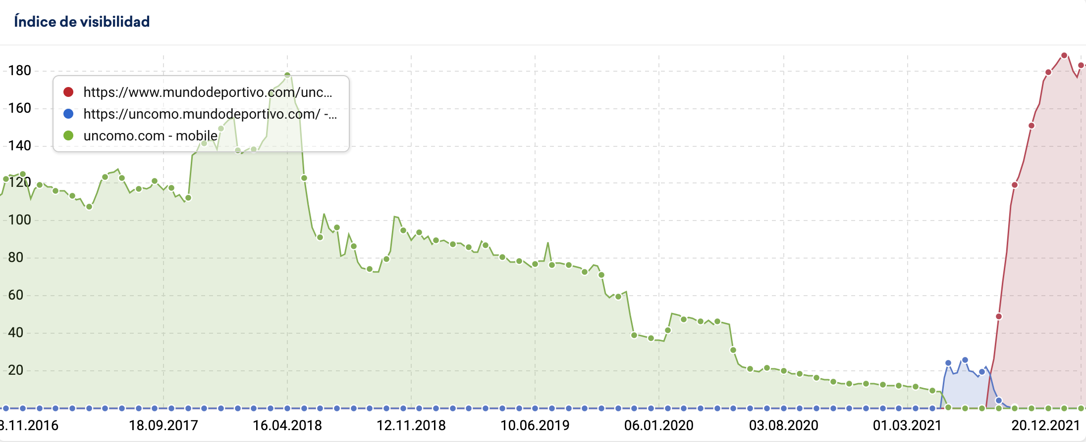Ya he hablado en varias ocasiones sobre el proyecto y el gran trabajo que realizó el equipo de Mundo Deportivo. También es de destacar cómo un buen contenido bajo un dominio de autoridad tiende a funcionar mucho mejor que un subdominio. Es algo que he visto en muchos casos y vivido en alguno de mis clientes. Así que puedo afirmarlo sin ruborizarme XD