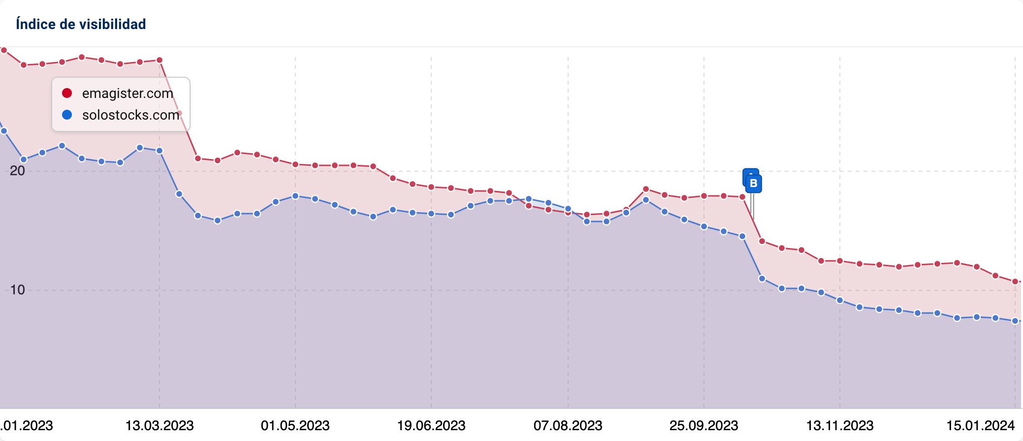 Lo mismo pasa con solostocks, emagister y los sitios web antes nombrados. Tiene una visibilidad muy inferior lo que hace que sea más difícil la comparativa visual con manomano, pero hay una correlación clara en la caída. Os dejo el gráfico comparando ambos.