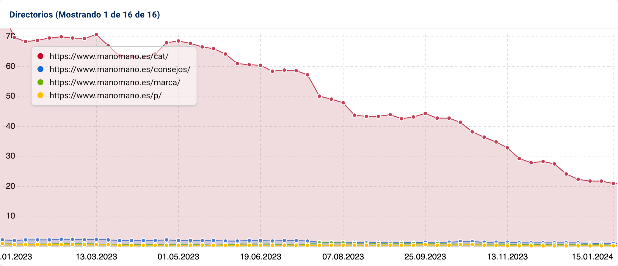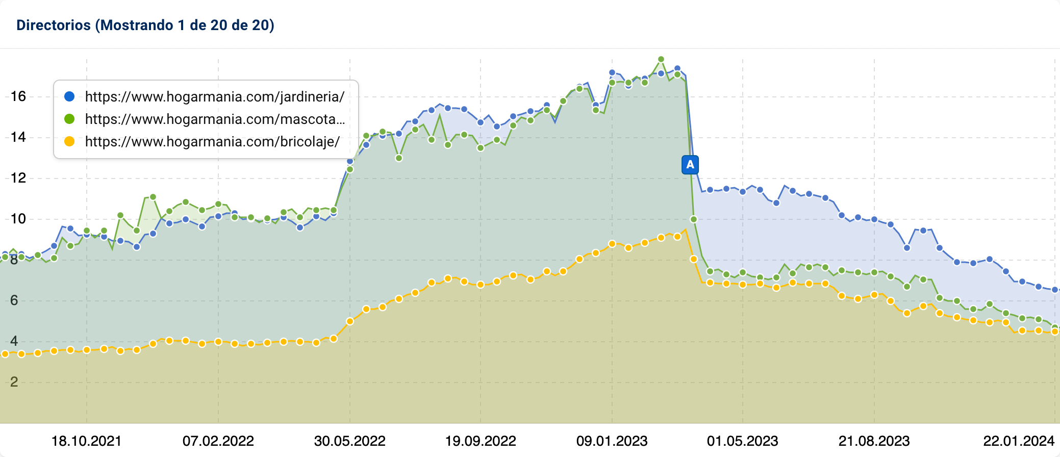 Como podéis ver le afectó y mucho el Core Update de marzo 2023. Y lo que le salva de un desastre mayor es la autoridad de su sección de cocina que actualmente representa el 80% de su visibilidad, pero solo el 50% de sus URLs.