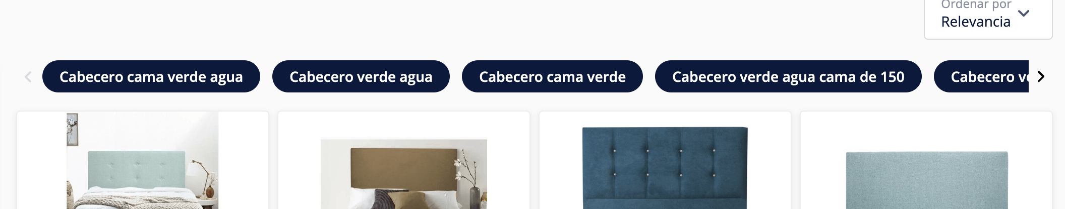 Os pondré un ejemplo: «cabecero de cama». Tiene 3,5k landings para cabecero y para que veáis la relevancia/calidad os enlazo una categoría y os dejo una captura de los enlaces de cabecera para “cabecero verde”. No hace falta tener mucho conocimiento SEO para detectar que tenemos un problema serio.
