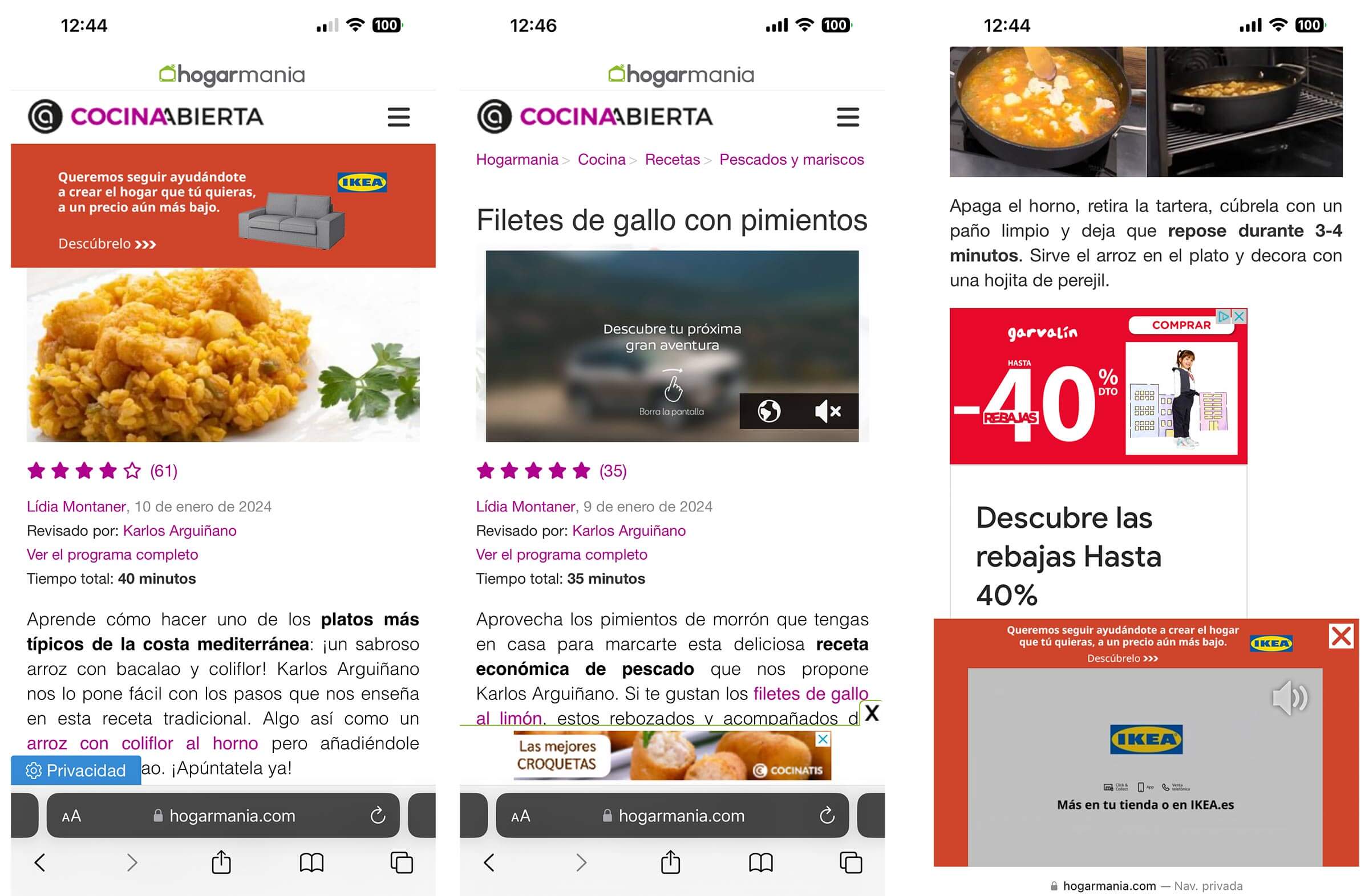 - Publicidad agresiva = Experiencia de usuario nefasta. Esto ya lo había comentado en alguno de mis videos de TikTok sobre Estrategia SEO y UX. Si tu contenido secundario o tu publicidad es una M, tu contenido principal es una M. Os dejo una imagen con 3 capturas de pantalla con el móvil de publicidades que tapan el titular / h1 (imagen izquierda), ocultan la foto principal con un video de publicidad (imagen centro) o dificultan la navegación con un sticky enorme en el footer (imagen derecha). Vamos, una fiesta en toda regla.