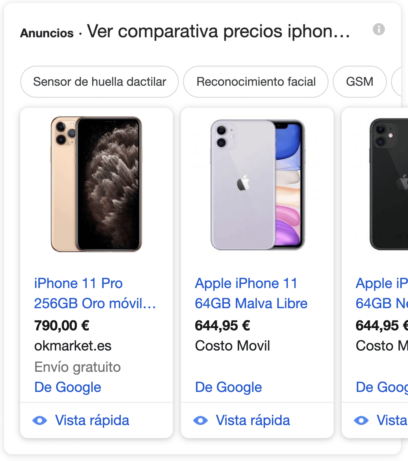 Los efectos son claramente visibles en las palabras clave para en las que se pelea por la comparación de precios de Google. Especialmente en un dispositivo móvil, la integración está mucho más presente y consume más espacio que los anuncios normales: