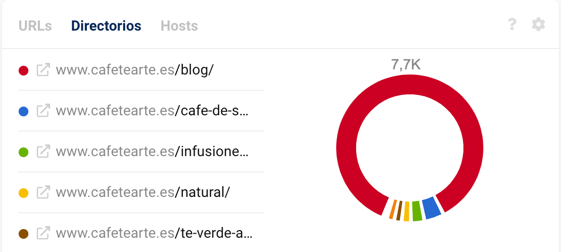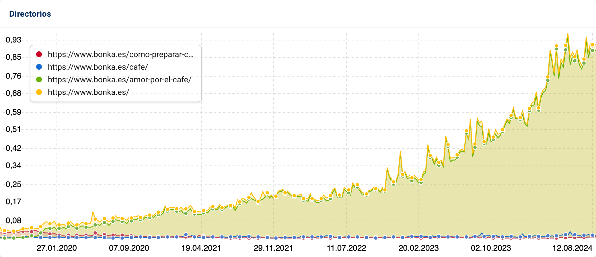 Es fantástico revisar sus directorios. La estructura de su web muestra claramente su estrategia. La mayoría del tráfico y de visibilidad proviene del directorio /amor-por-el-cafe/, su parte informativa.