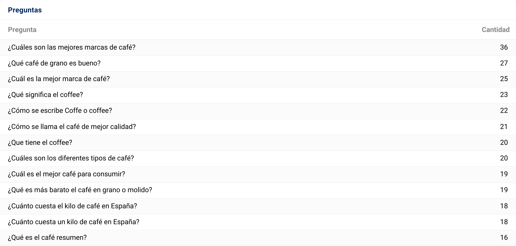 Podemos encontrar palabras clave populares como mejor café en grano con 950 búsquedas, tiendas de café con 850, café online con 400, café especialidad con 550 o tipos de café grano con 150. Todos son números de España.
