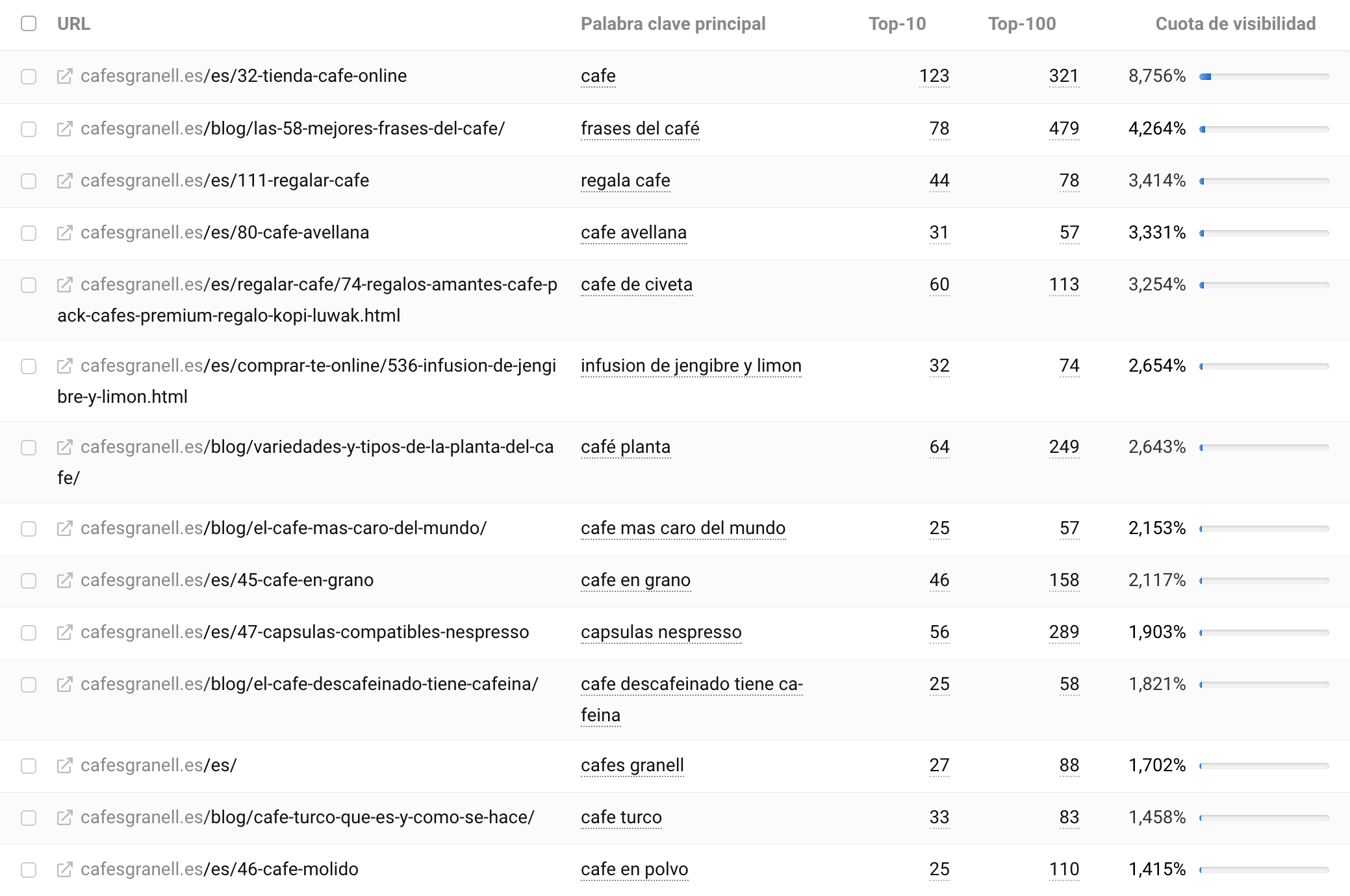 Para empezar, podemos ver que su mejor URL es su página destinada a la tienda, que no es la portada. La página principal en español posiciona por palabras clave de marca y por “tostadero de café”, mientras que la URL /32-tienda-cafe-online lo hace por mejores palabras como “café”, “tienda de café”, “tienda online café” o “café online”. Nada mal.