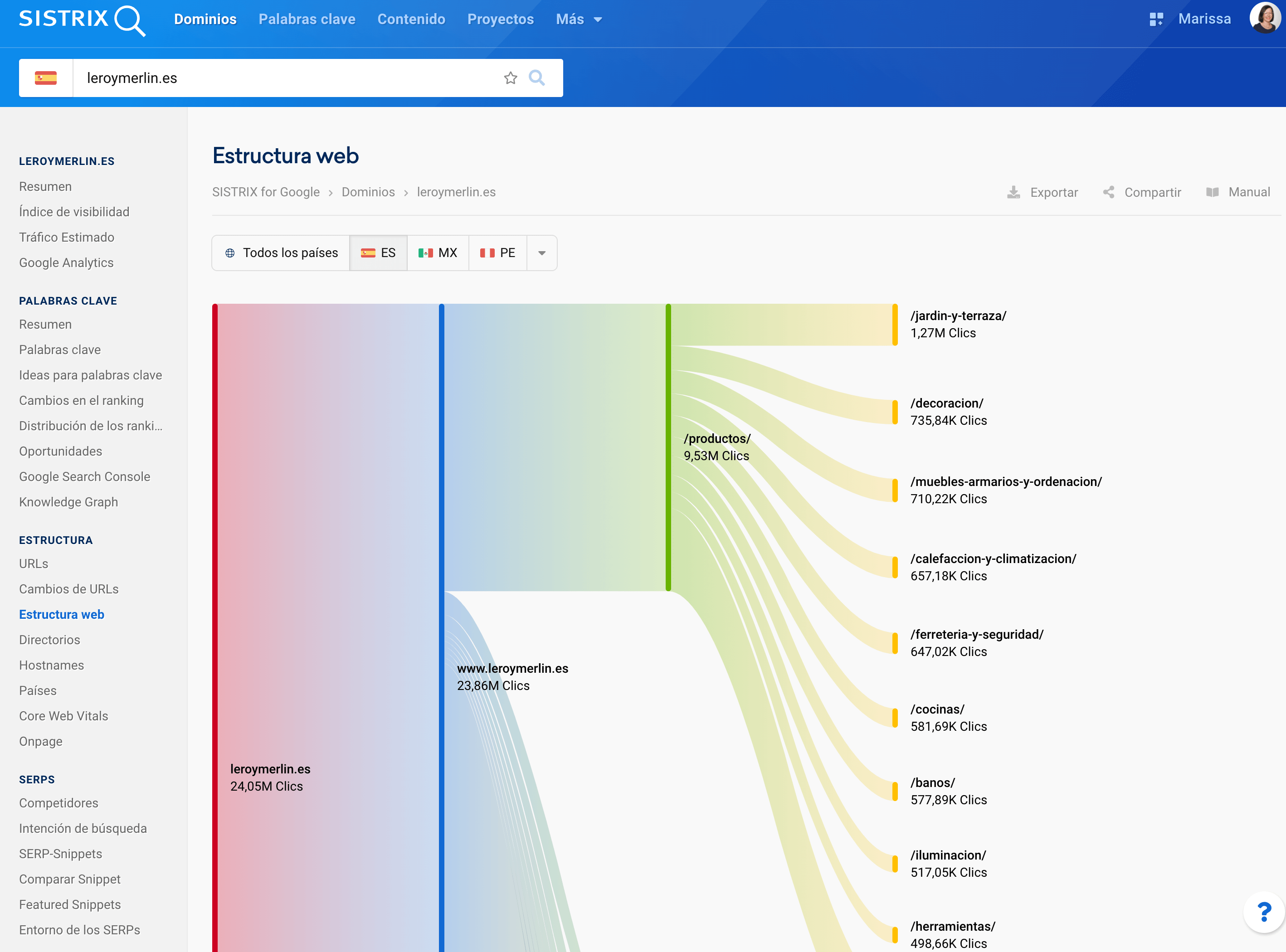 Para reflejar cómo se estructuran los sitios web y cómo se distribuyen los clics en cada página, hemos introducido una nueva función en SISTRIX que puedes encontrar en el menú lateral izquierdo tras introducir un dominio, bajo «Estructura web«.