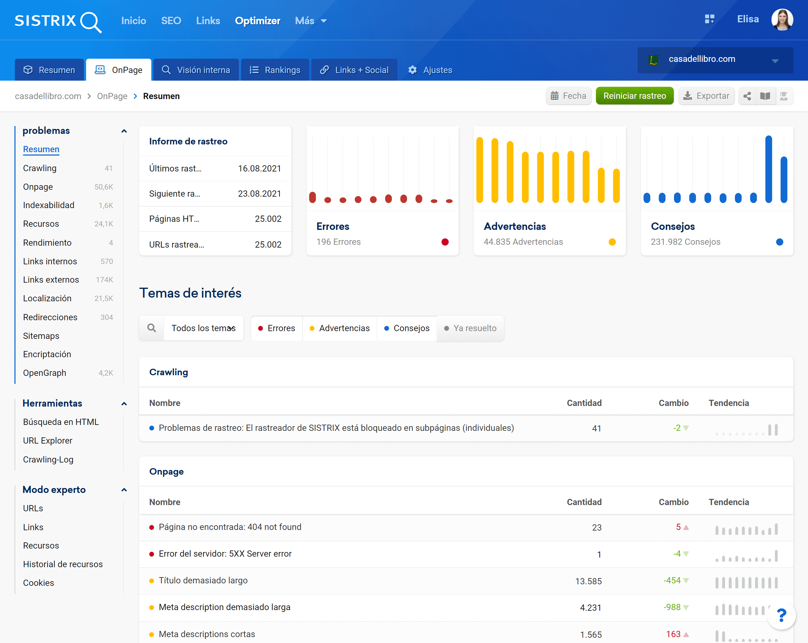 Hemos añadido muchas nuevas comprobaciones a Optimizer, que ahora realiza búsquedas en más de 100 fuentes de error diferentes, de forma completamente automática y con cada rastreo. Además de los temas clásicos de SEO, Optimizer ahora también te recuerda, por ejemplo, que el certificado SSL del dominio está a punto de caducar o detecta errores en el texto fuente HTML de las páginas que conducen a un error de análisis.