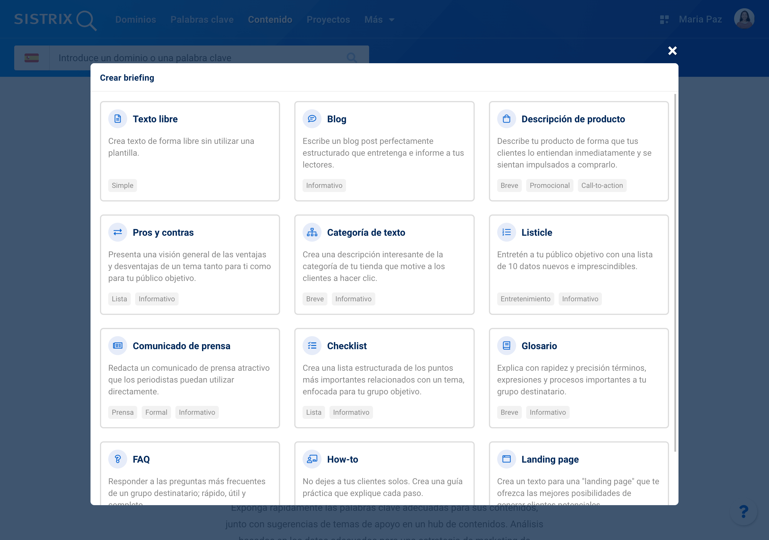Para facilitar la creación de contenidos en el Content Assistant AI te ofrecemos ahora plantillas personalizadas para temas que pueden utilizarse para distintos fines. Tras hacer clic en «Crear briefing», puedes elegir entre los siguientes tipos de contenido: