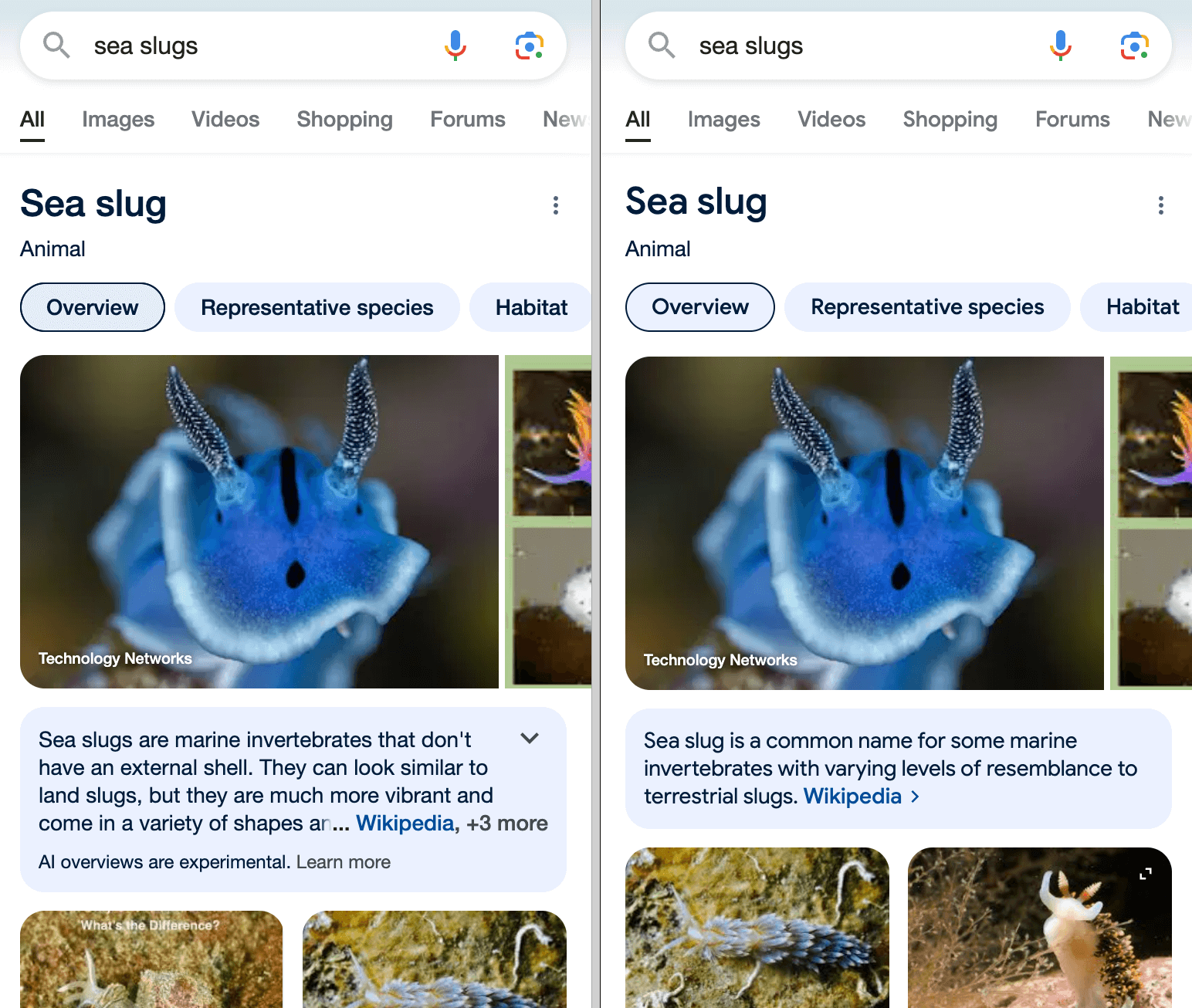 En la parte derecha aparecen los conocidos SERPs. Debajo de la integración de las imágenes, se cita un breve resumen de Wikipedia en el Knowledge Panel. A la izquierda está la nueva versión: la IA de Google ha creado un texto explicativo más largo, basado en Wikipedia y otras tres fuentes. Al final del recuadro, se muestra de forma transparente que este contenido ha sido generado por IA.