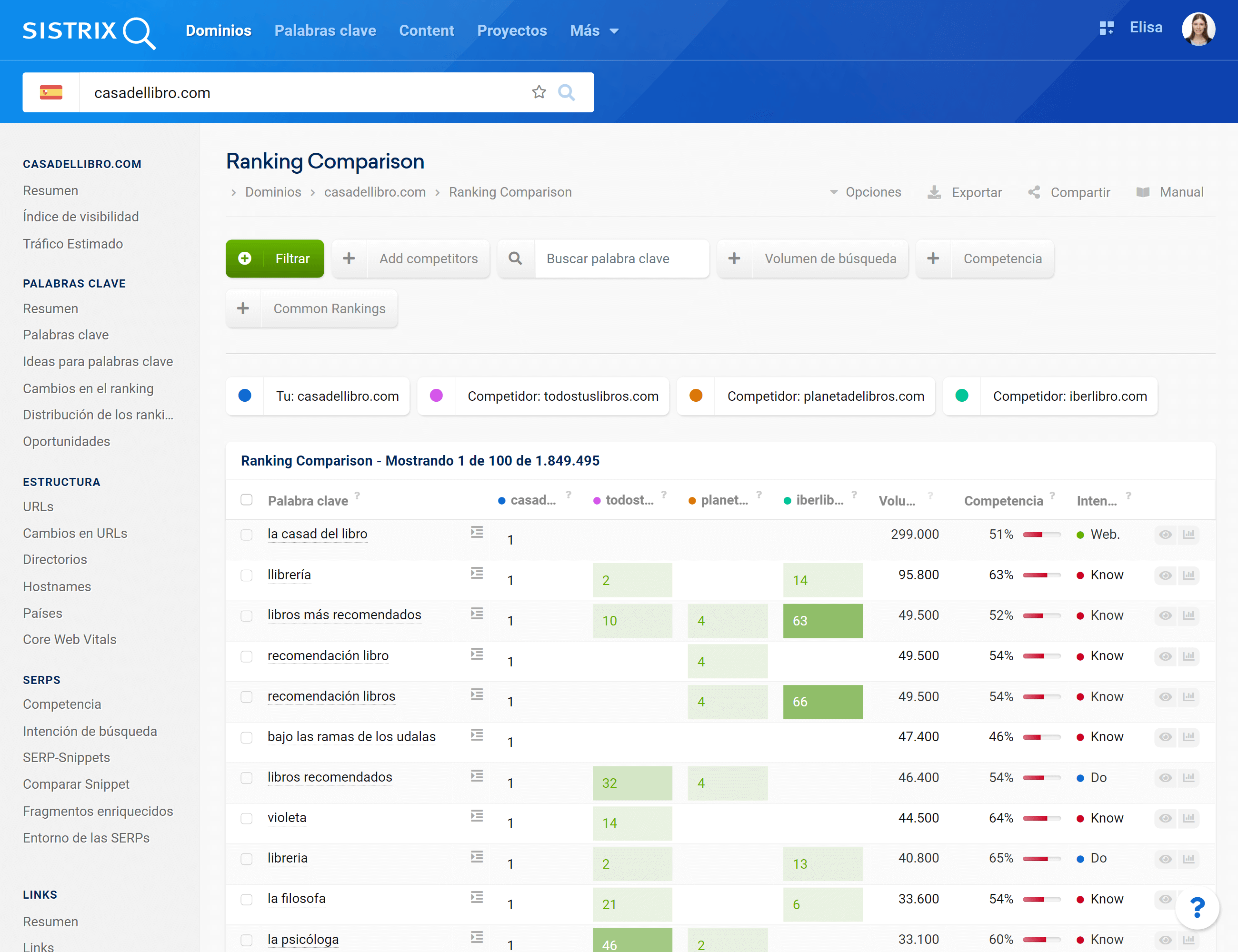 Para poder ver de un solo vistazo cómo se compara tu dominio con la competencia a nivel de palabras clave, tenemos la función «Comparar palabras clave» dentro del apartado «Competencia».