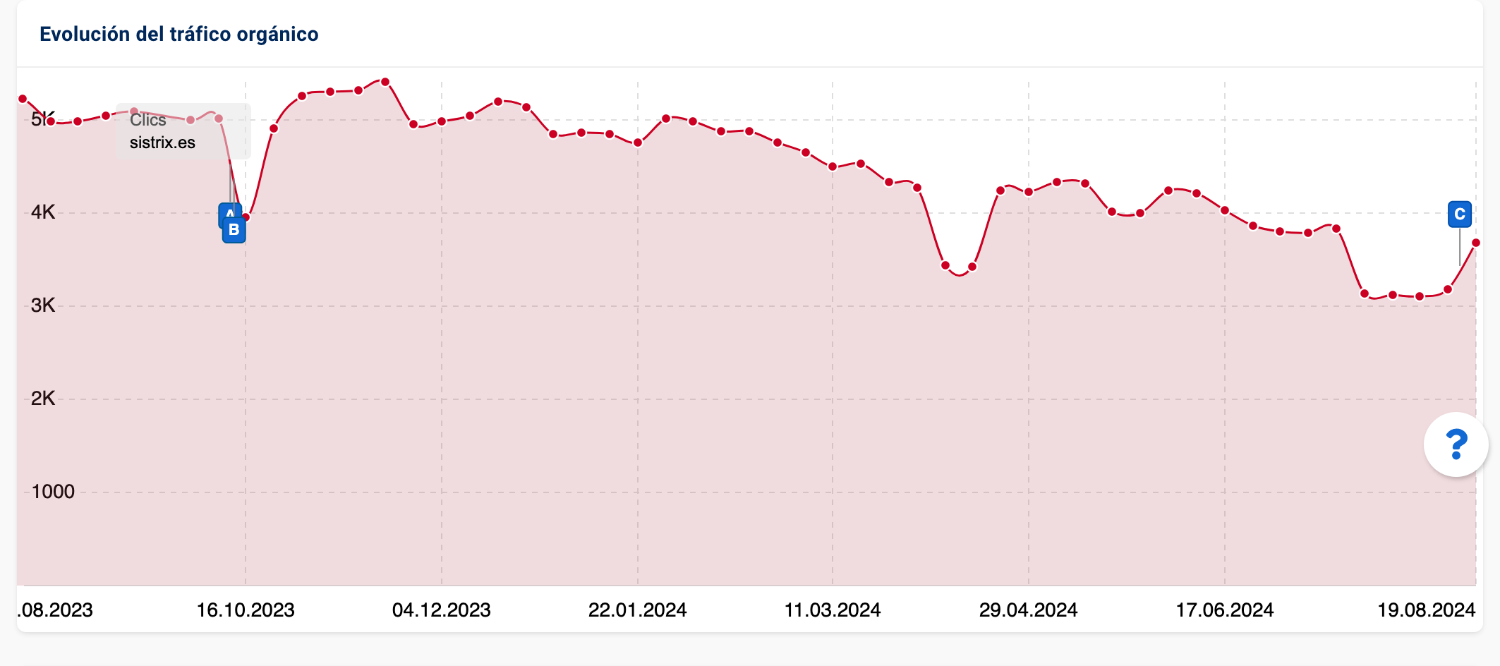 Incluso si el volumen de búsqueda es estable puede que el número de clics orgánicos por posición sea completamente diferente en función de la intención de búsqueda, así como de la distribución de los SERPs. El gráfico de evolución te permitirá reconocer mejor los cambios y analizar con mayor profundidad los antecedentes.