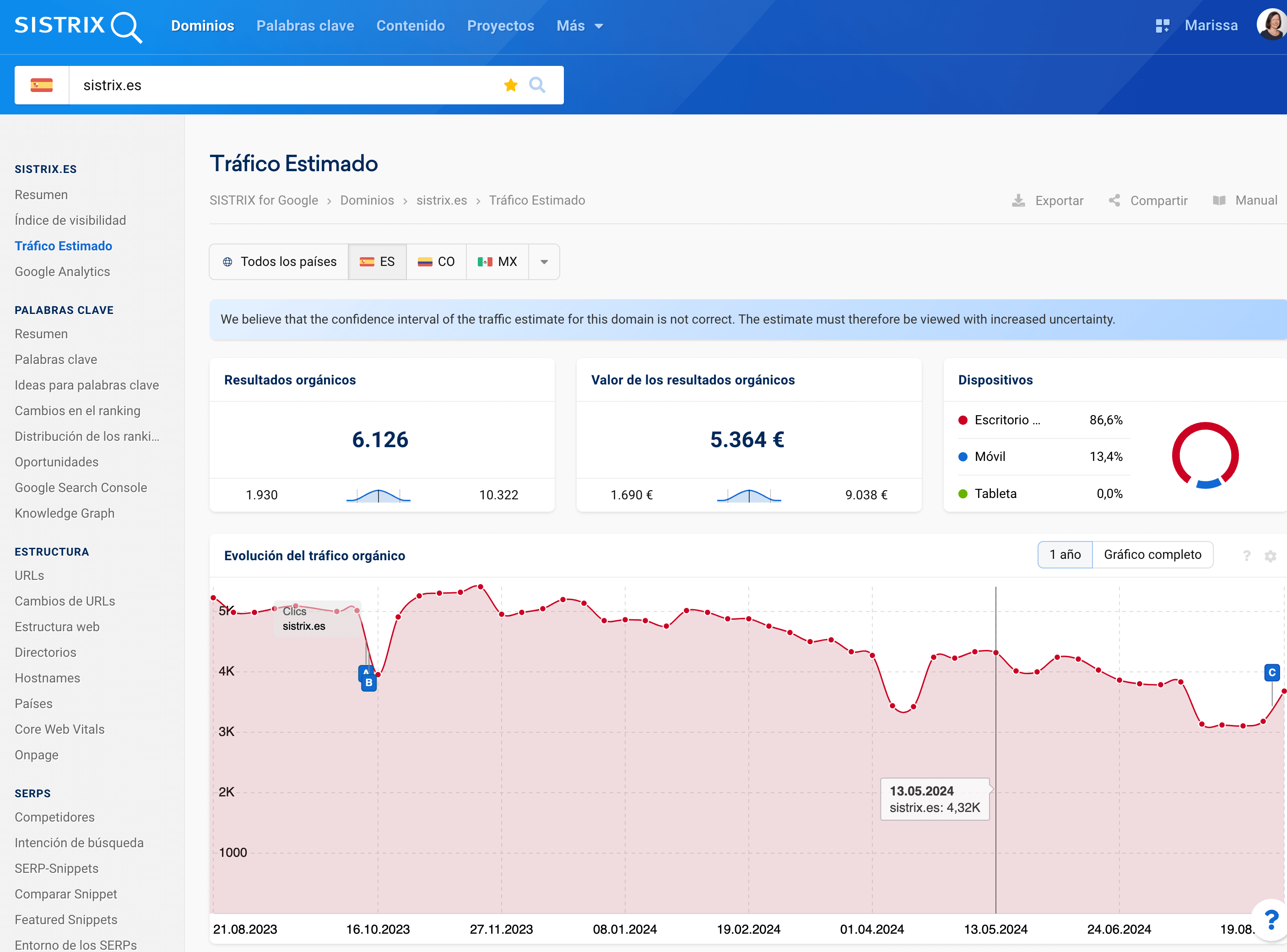 Tras un periodo de prueba de esta función a través de SISTRIX Labs, esta está ahora disponible para todos los usuarios. Si introduces un dominio (o un host, o un directorio, o una URL) en el buscador de SISTRIX puedes acceder a esta función desde el apartado «Tráfico estimado» en el menú lateral izquierdo. ¡Diviértete utilizándola!