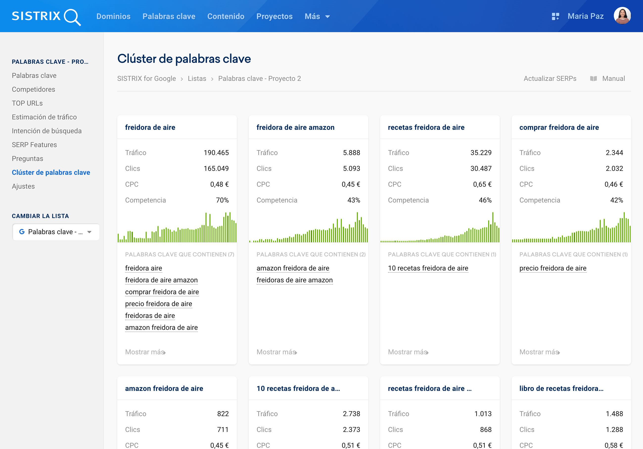 Este clustering refleja la comprensión de Google de palabras clave similares y relacionadas. Esto te permite identificar rápidamente qué temas requieren tus propias páginas y qué palabras clave deben tratarse en ellas.