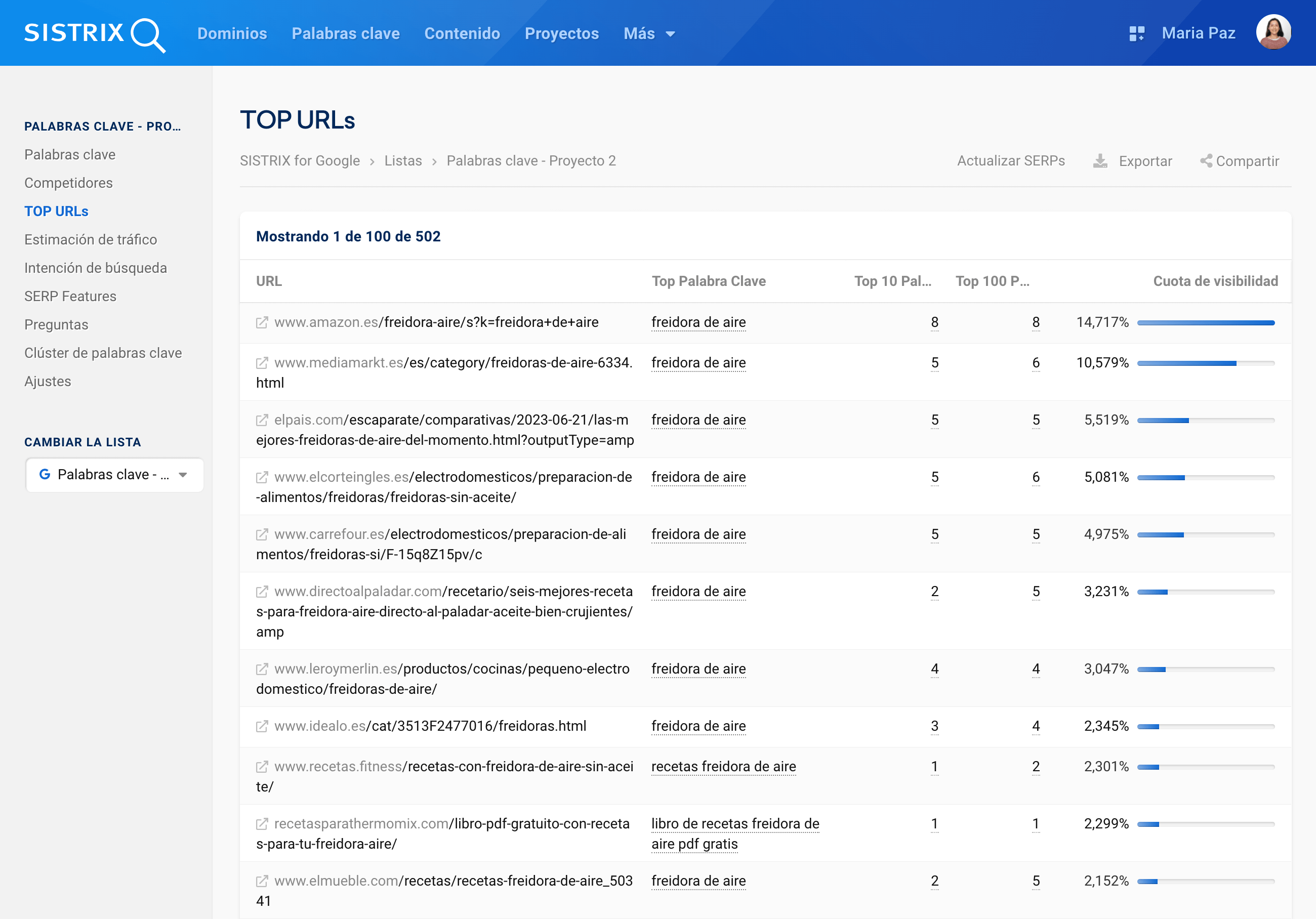 La tabla es similar a la del apartado «Dominios», pero se centra no solo en las Top URLs de un dominio concreto, sino en las URLs mejor posicionadas en función de los rankings de las palabras clave de tu lista.