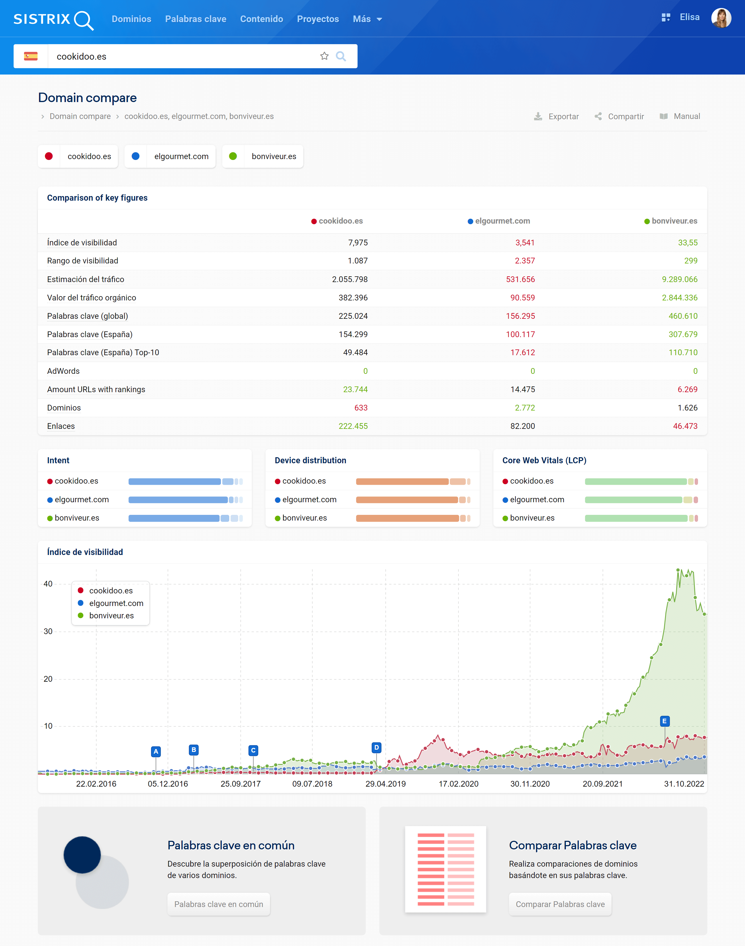 Para utilizar la nueva comparativa entre dominios, solo has de hacer clic en «Comparar con la competencia» en el resumen general de un dominio o introducir los dominios a comparar separados por una coma en la barra de búsqueda SISTRIX: dominioA.es, dominioB.es, dominioC.es. Puedes comparar hasta 7 dominios.