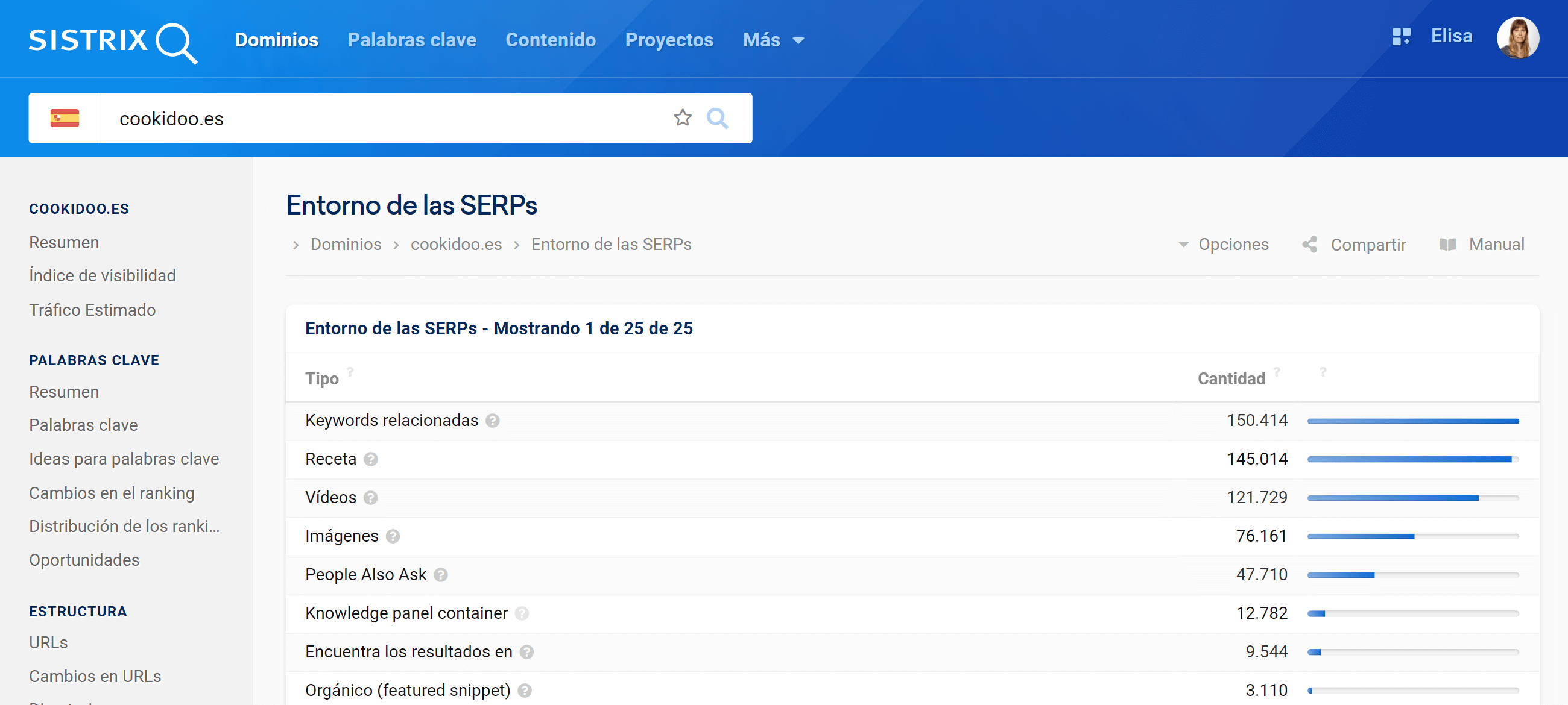 El entorno de los SERPs muestra qué otras integraciones SERP aparecen en las páginas de resultados de búsqueda en las que un dominio ya posiciona a nivel orgánico. De este modo, podrás analizar rápidamente qué formatos de contenido considera Google útiles: ¿Se trata de más vídeos, resultados locales o recetas?