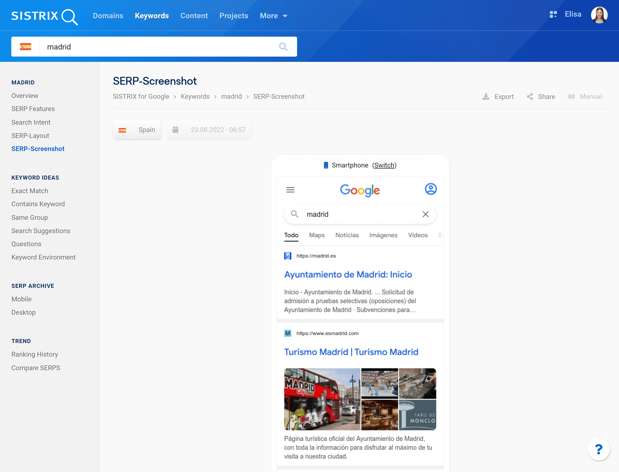Para poder hacer un seguimiento de los resultados de búsqueda que muestra Google de la mejor manera posible, ahora ofrecemos la posibilidad de ver capturas de pantalla de los SERP en SISTRIX. Al analizar una palabra clave a través del buscador de la herramienta, en la opción «SERP-Screenshot» del menú lateral izquierdo, encontrarás una captura de pantalla de la última versión de los SERP que hemos rastreado: