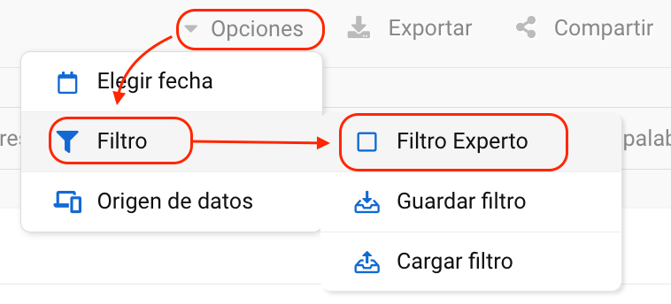 Las funciones de filtrado en SISTRIX se han diseñado de forma que te llevan a los resultados que desees de forma rápida y sencilla, en la mayoría de los análisis. Para los casos en los que no, puedes usar nuestro «Filtro Experto». Éste se puede activar prácticamente en todas las tablas desde el menú desplegable «Opciones», ubicado en la parte superior de la tabla.
