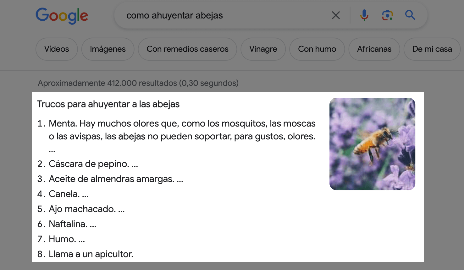 Ejemplo Featured Snippet "como ahuyentar abejas"