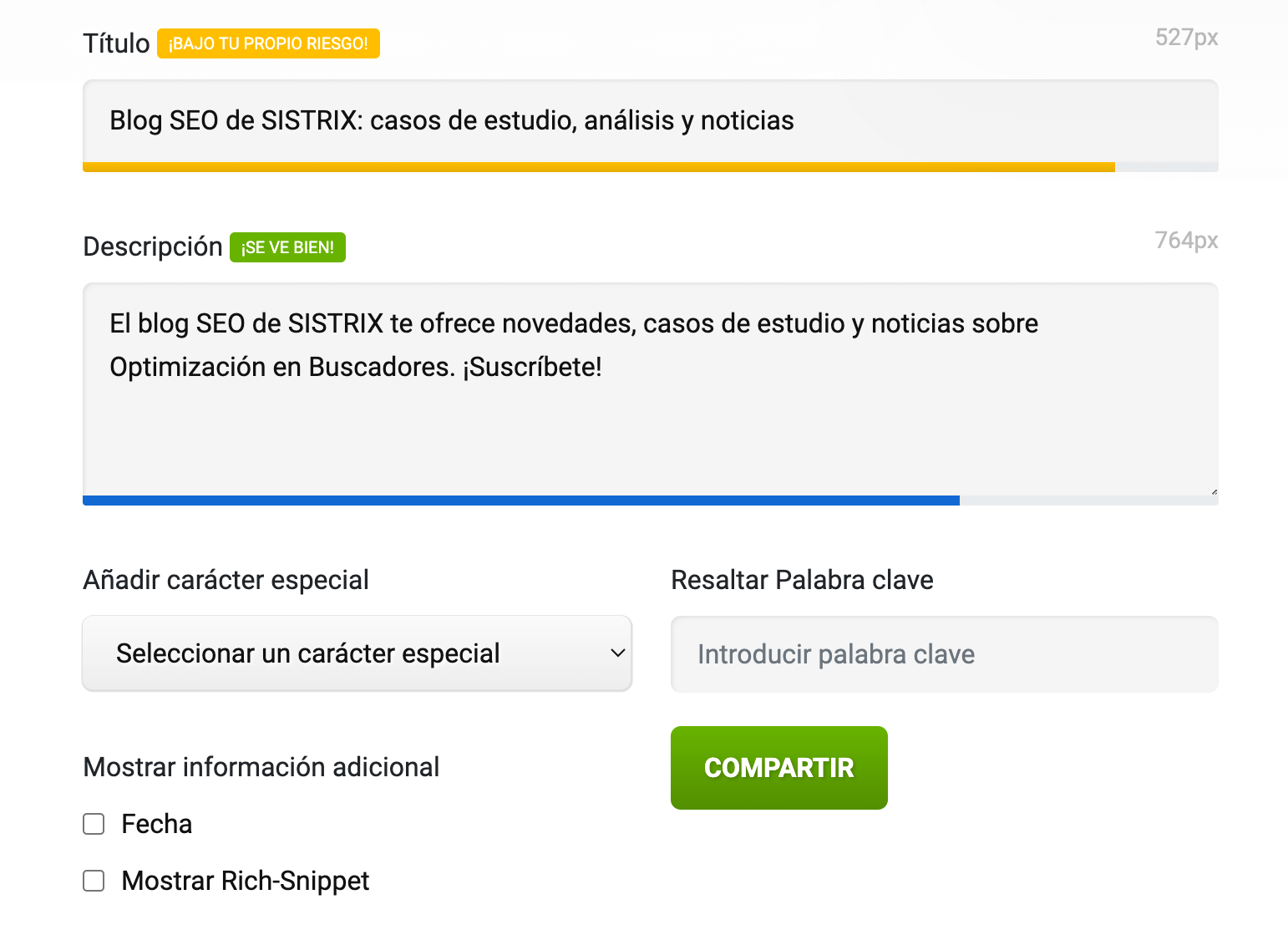 • Con el generador de Snippets, puedes ver el aspecto que tendrá tu Snippet en los resultados de búsqueda de Google en cuanto lo crees. Te muestra cuándo has alcanzado o superado la longitud correcta para el título y la descripción. También tienes la opción de establecer caracteres especiales y añadir palabras clave directamente desde la herramienta.