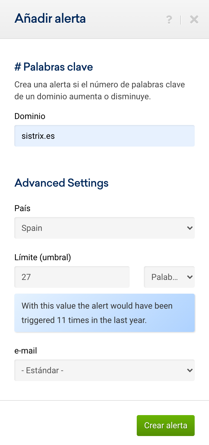 Esta alerta controla el número de palabras claves en el ranking de Google hasta la posición número cien del país elegido. Esta alerta es bastante importante, ya que si un dominio pierde palabras claves, pierde términos de búsqueda. El número solamente disminuye si estas palabras claves caen por debajo de la posición 100.