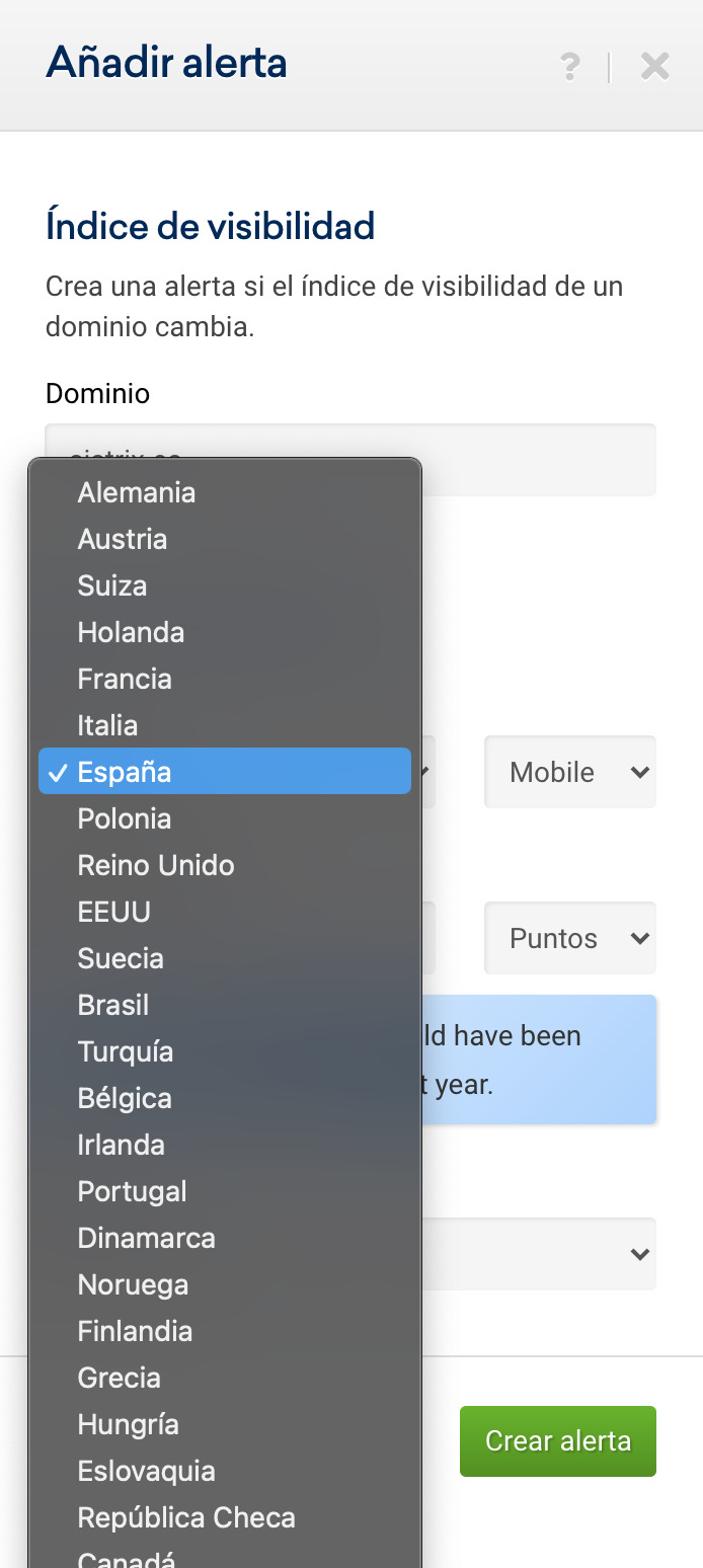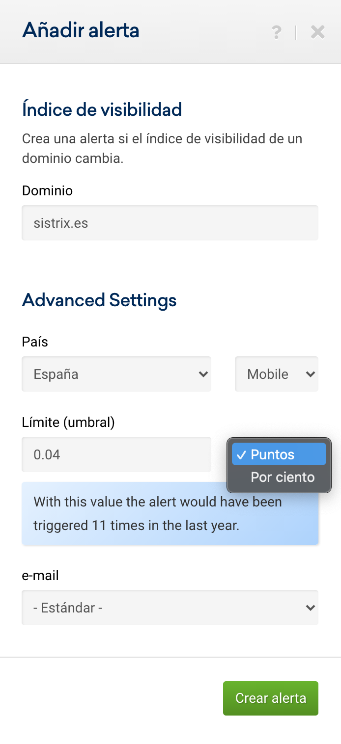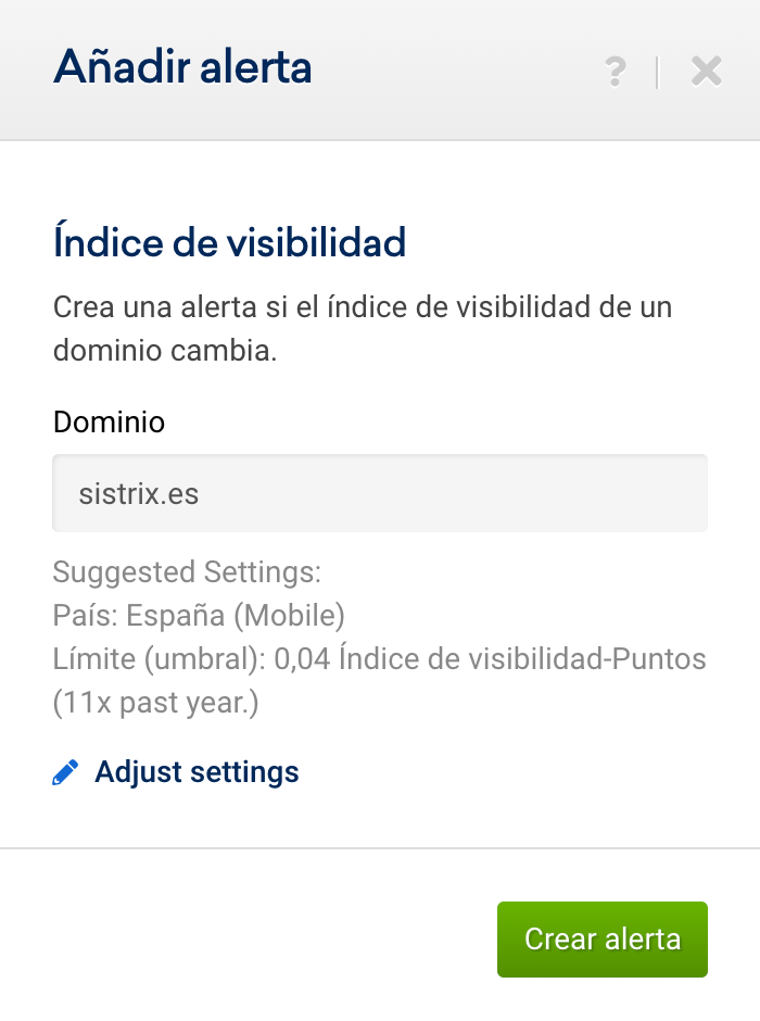 El índice de visibilidad es una variable importante a controlar, te informa sobre los cambios -positivos o negativos- en el ranking de Google. Simplemente pulsando sobre el icono se abrirá el recuadro de «Opciones», donde deberás introducir el dominio que deseas controlar, por ejemplo, sistrix.es: