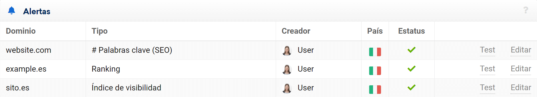 En la parte inferior encontrarás una lista completa con todas las alertas que has creado, que se agruparán según el dominio.