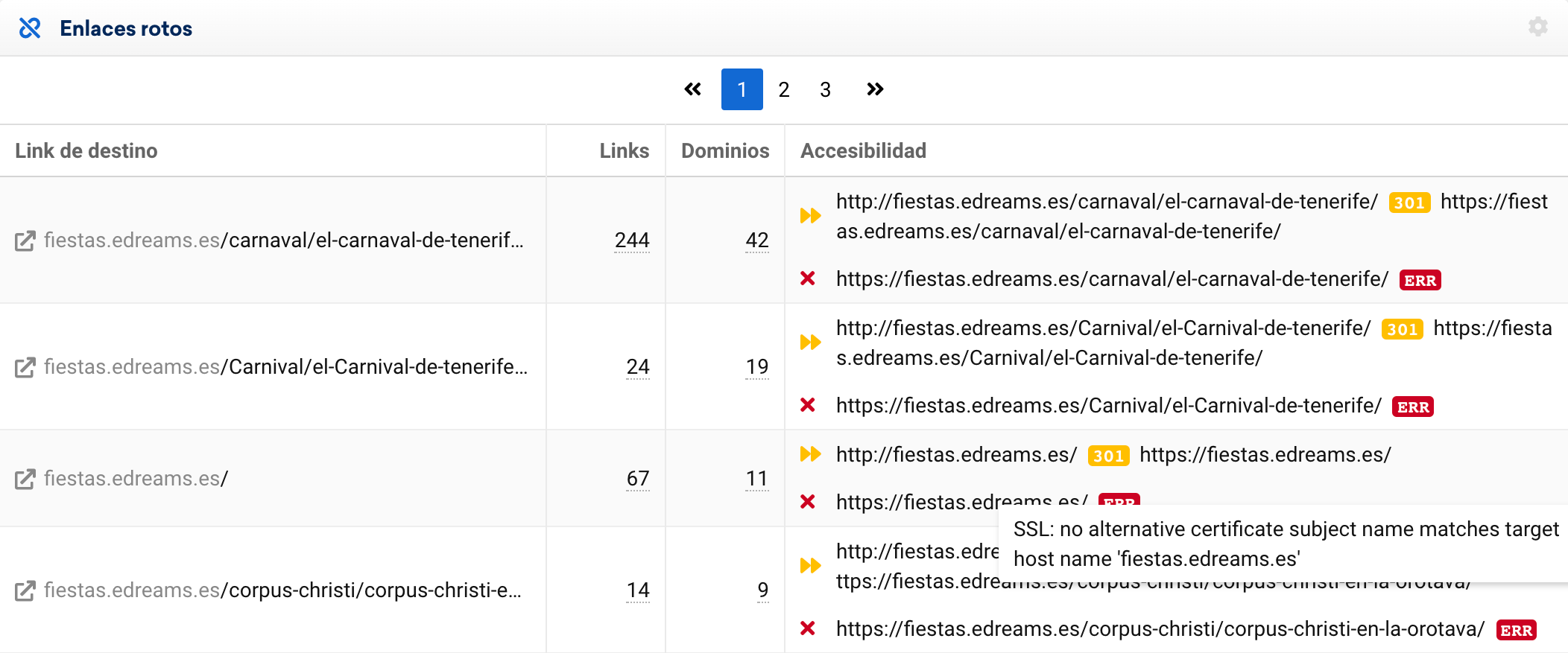 Si no lo hubiera hecho así me habría perdido estos enlaces rotos porque dan error de certificado, por lo que un navegador no es capaz de entrar a ver el estado final, que realmente es un 404.