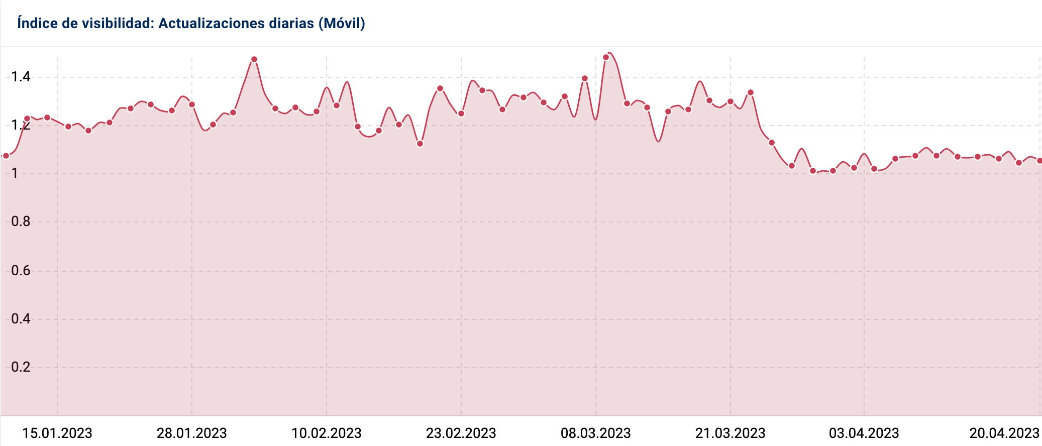 Comparemos el gráfico anterior con el del Índice de Visibilidad que se nos muestra cuando introducimos el dominio en la barra de búsqueda de SISTRIX, y veamos también aquí los datos diarios para dispositivos móviles: