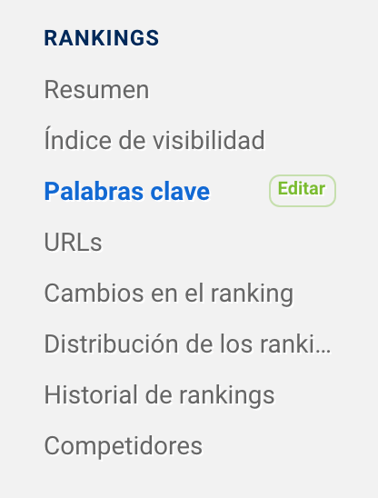 Ahora te encuentras en la vista «Editar» de tus palabras clave, reconocible por la palabra verde «Editar» al lado derecho de «Palabras clave» en el apartado «Rankings»: