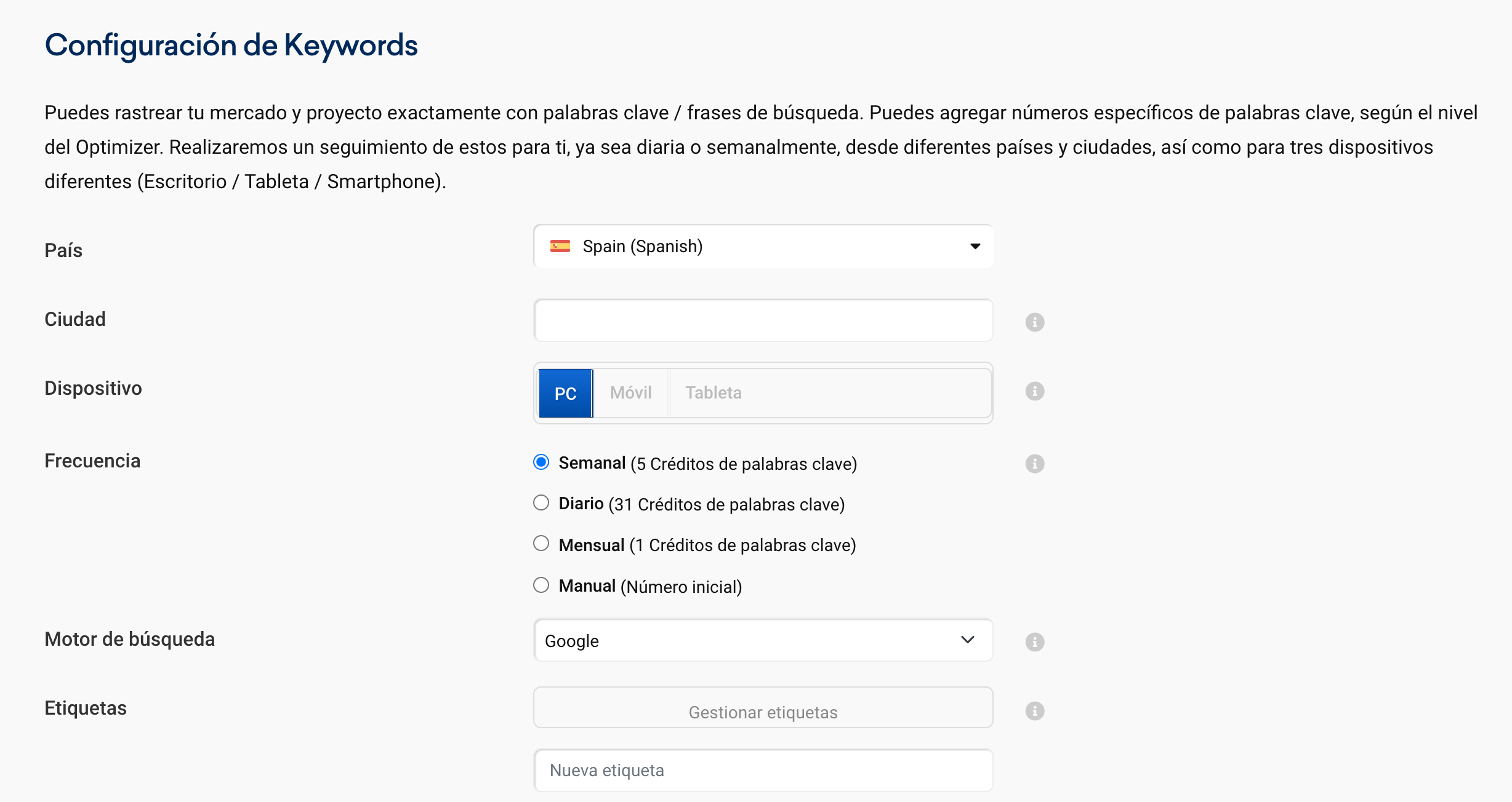 - Elige para qué motor de búsqueda deben rastrearse tus palabras clave. Puedes elegir entre Google, Bing, Yahoo y Yandex.
