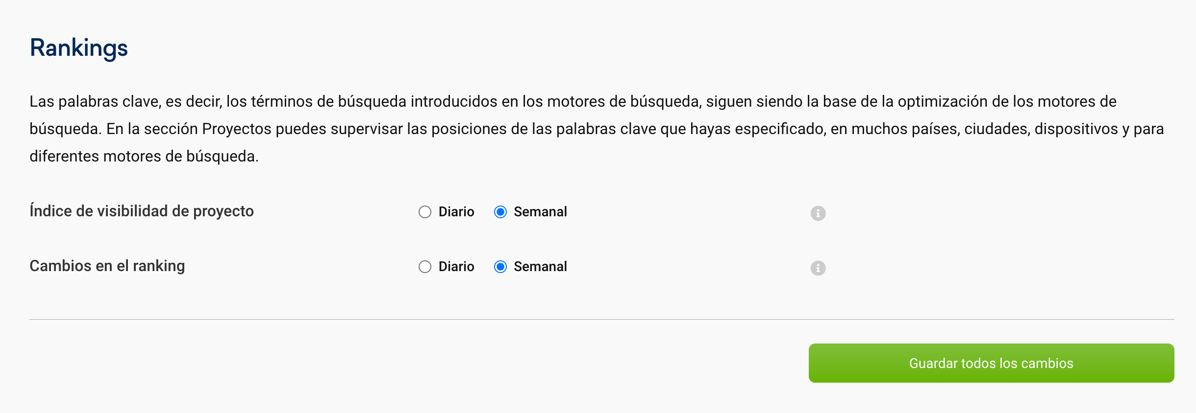 Nota: Lo ideal es que ambos estén configurados con la misma frecuencia, ya que si, por ejemplo, configuras los cambios en el ranking con una frecuencia semanal y el Índice de Visibilidad con una frecuencia diaria, éste último no cambiaría cada día, sino cada lunes.