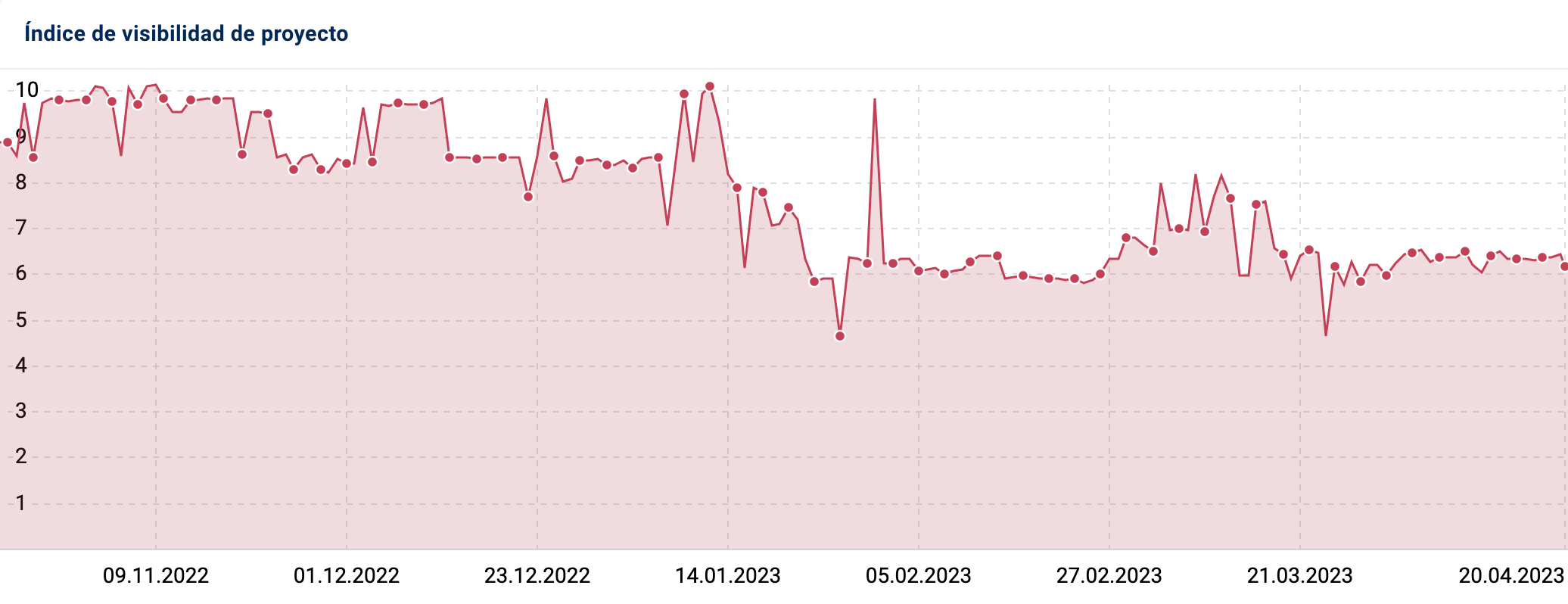 Por defecto, cada semana se añade un nuevo punto de medición al Índice de Visibilidad (también lo puedes configurar con una frecuencia de rastreo diario). De esta forma, al cabo de unos días o semanas, dependiendo de tu configuración, ya puedes ver una primera tendencia de los movimientos de tus palabras clave.