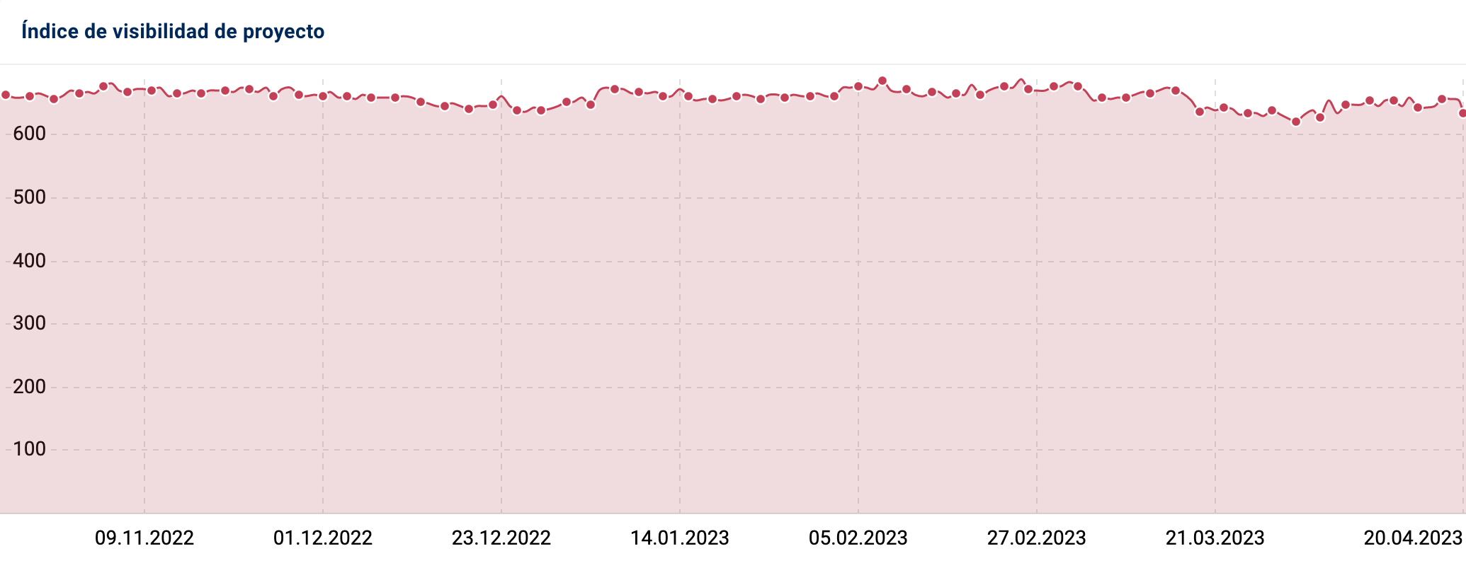 Para una mejor ilustración, hemos seleccionado un ejemplo con un conjunto de 370 palabras clave, actualizadas diariamente para dispositivo móvil. Puedes ver claramente una tendencia estable con un valor de visibilidad del proyecto muy alto.