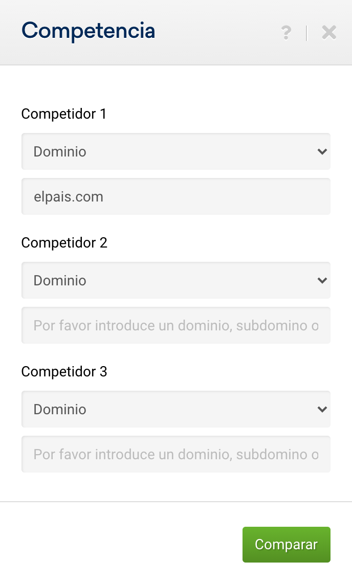 Aquí puedes introducir hasta tres competidores y, entonces, hacer clic en el botón «Comparar»(recuerda que puedes comparar dominios, subdominios o URLs entre sí). En nuestro ejemplo, comparamos elmundo.es con elpais.com. NOTA: Si introduces más de un dominio, solo se considerarán los backlinks en común.