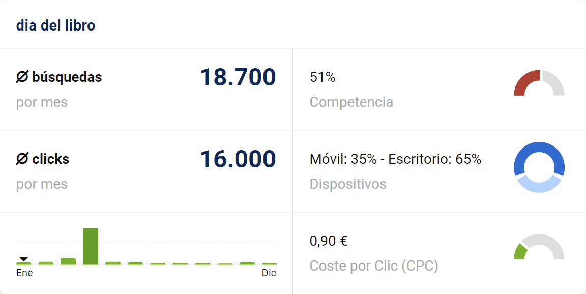 En estos recuadros de datos puedes ver más datos relacionados con la palabra clave correspondiente. Por ejemplo, en qué proporción se busca la palabra clave a través de dispositivo móvil o de escritorio o, cuantos clics tiene esa palabra de media.