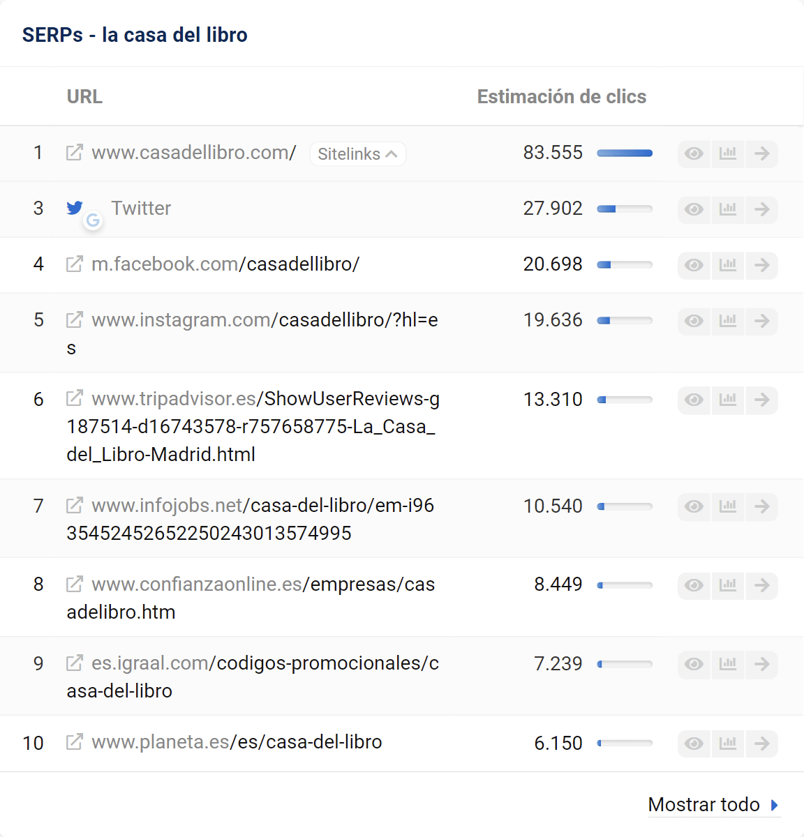 En el último recuadro de datos junto a la tabla puedes ver la estructura de los SERPs actual para la palabra clave correspondiente. Aquí puedes ver qué URLs se encuentran actualmente entre las diez primeras posiciones de la página de resultados de búsqueda y cuántos clics es probable que reciba el dominio en esta posición.