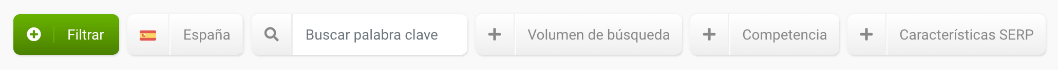 Los filtros de volumen de búsqueda, competencia y características SERP ya están disponibles como filtros predefinidos encima de la tabla. Puedes crear filtros individuales mediante el botón verde «Filtrar».