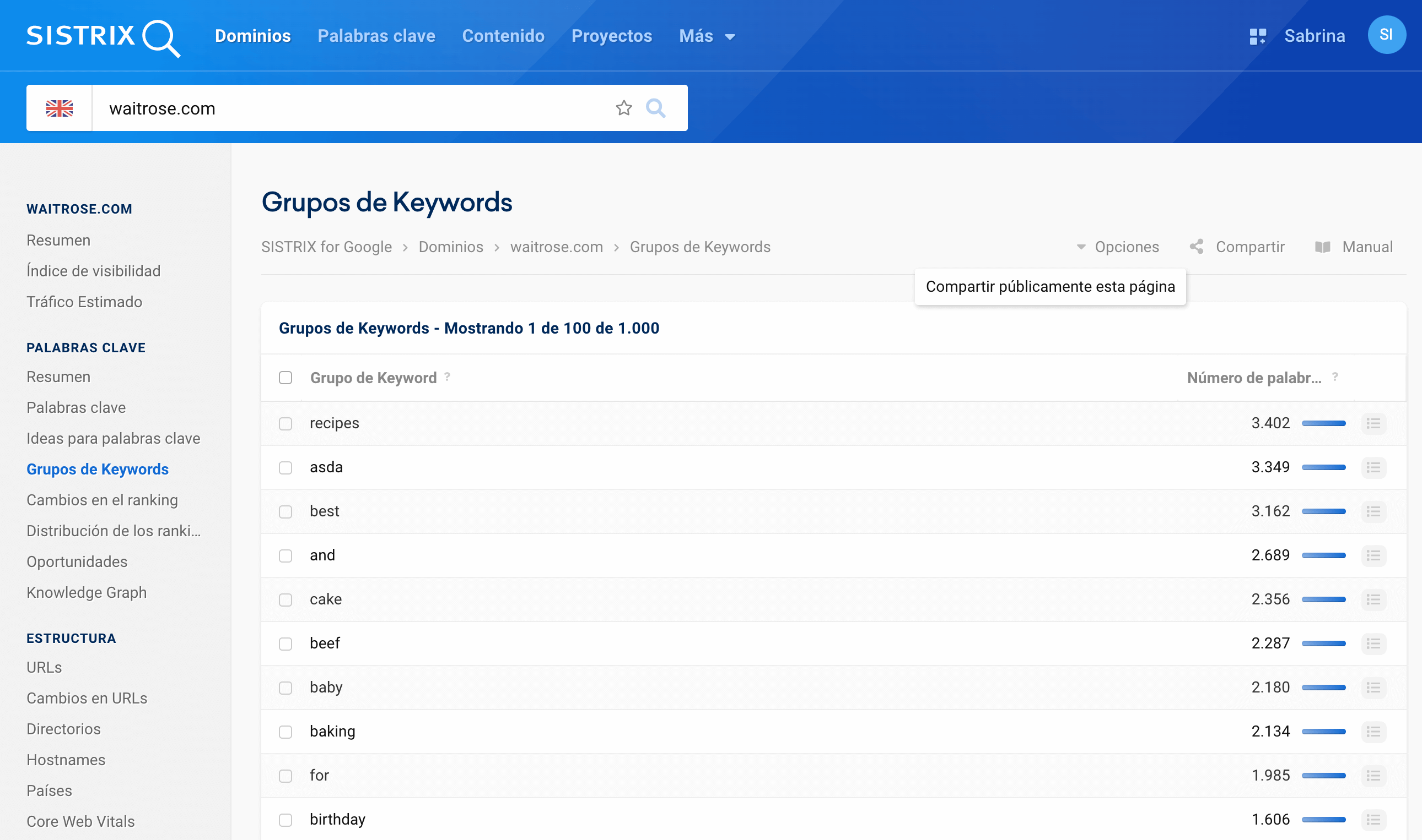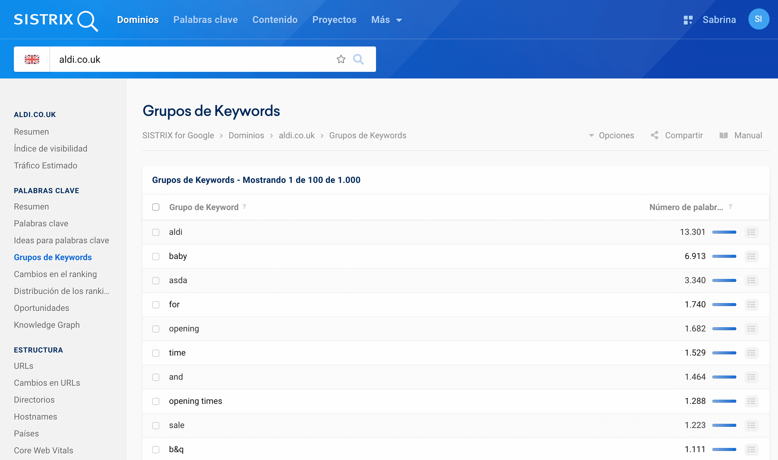 También puedes descubrir nuevas palabras clave con la función de «Grupos de Keywords» de SISTRIX. Puedes identificar temas relevantes de forma rápida y fácil en tu propio sitio web o en el de tus competidores y localizar las principales palabras clave.
