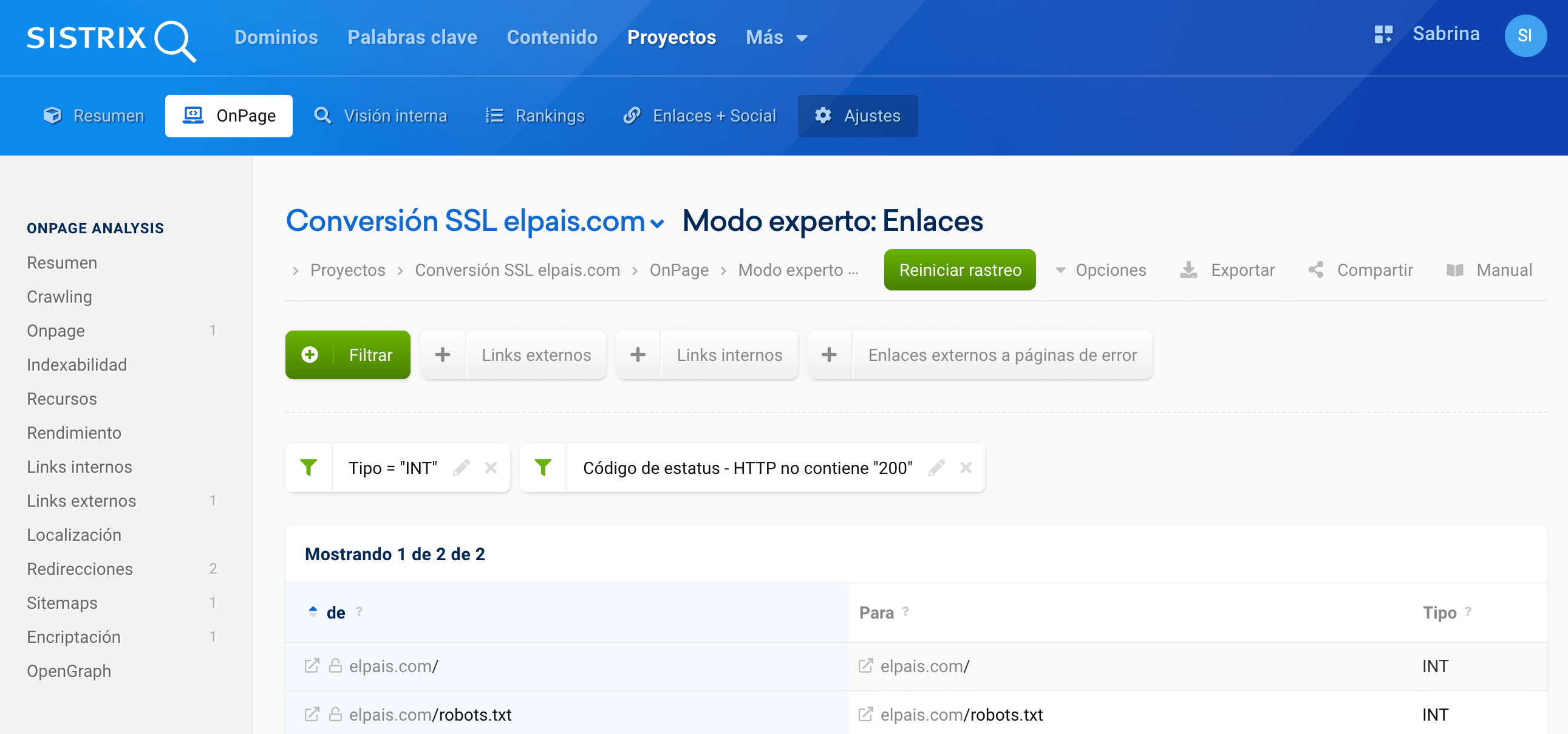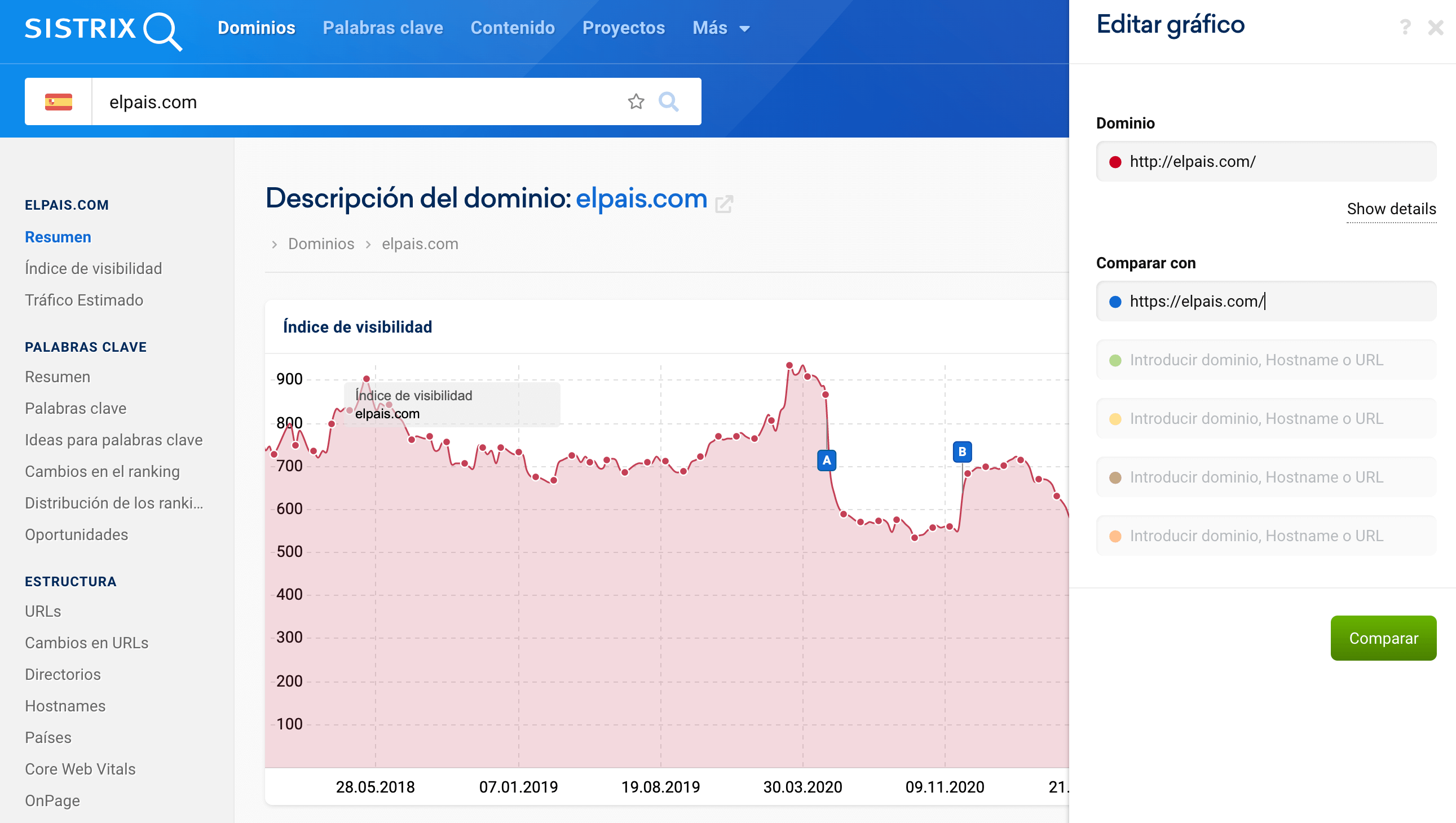 En nuestro ejemplo decidimos analizar únicamente el subdominio «elpais.com» 3.