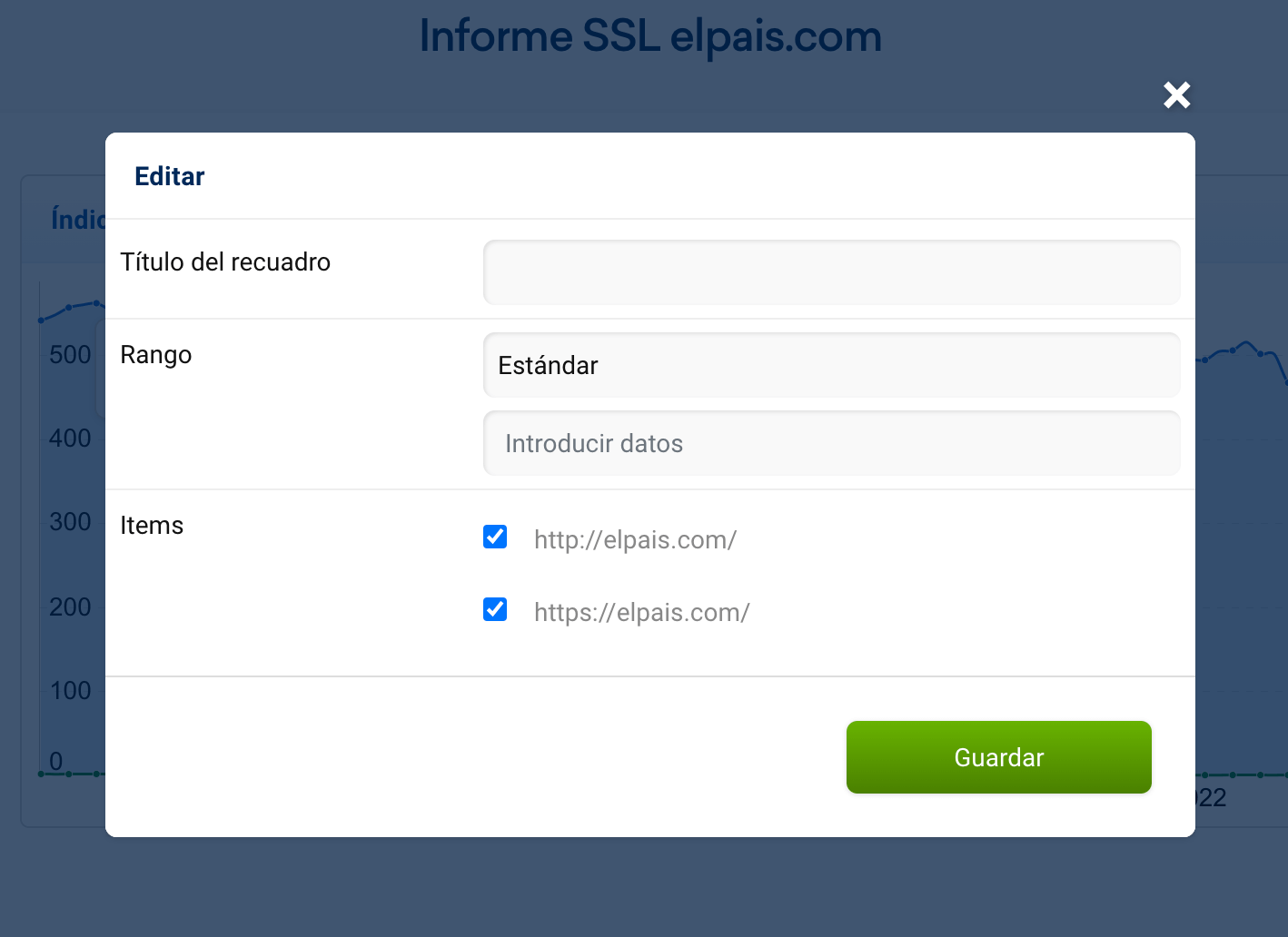 Al seleccionar «Crear nuevo Informe» es importante que le demos un título significativo, en nuestro ejemplo «Informe SSL elpais.com».