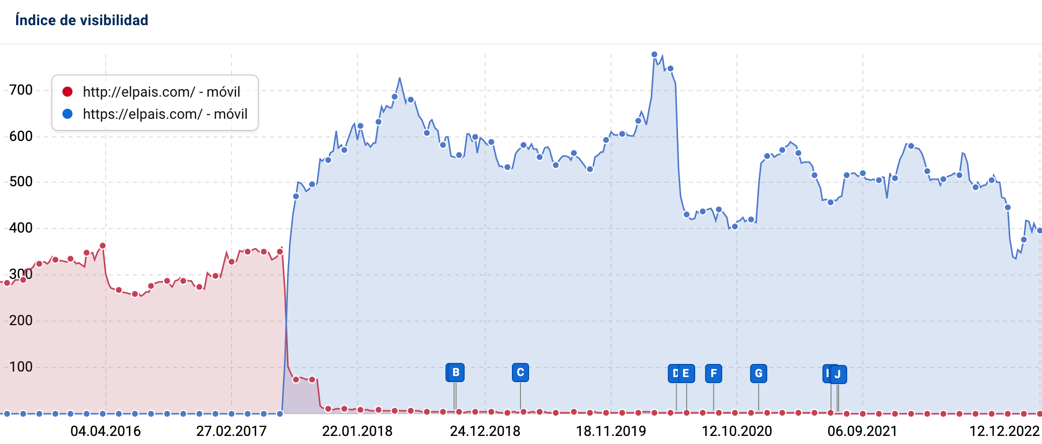 Una vez realizado el cambio a HTTPS, Google volverá a rastrear las respectivas páginas HTTP para encontrar redireccionamientos 301 a la versión HTTPS de cada página. Para evaluar en qué punto se encuentra Google durante este proceso, basta con echar un vistazo a la versión de protocolo que Google muestra en los resultados de búsqueda.