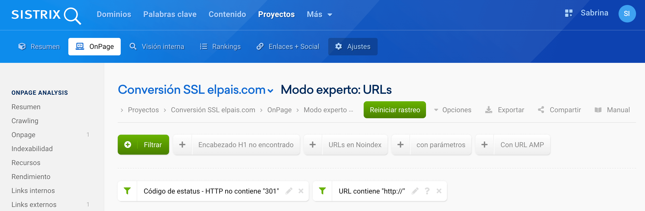 Para comprobarlo, selecciona «URLs» en el menú de la izquierda en el apartado «Modo Experto» (situado en la sección Onpage del proyecto creado para el dominio) y haz clic en el botón verde «Filtrar». Esto te permitirá establecer filtros personalizados, por ejemplo, para la URL como: contiene el texto “http://” y para el Código de estado – HTTP como: no contiene el texto “301”.