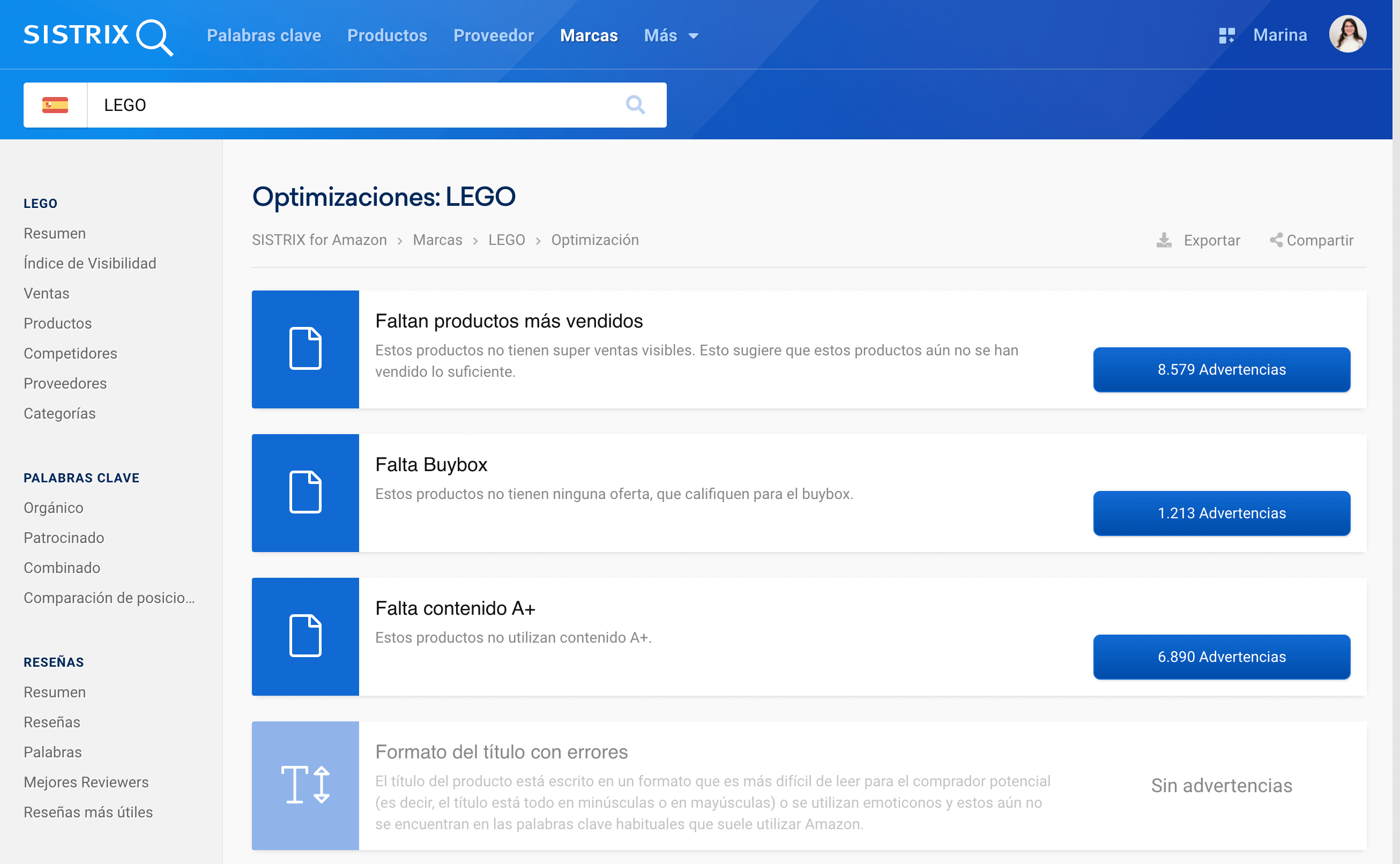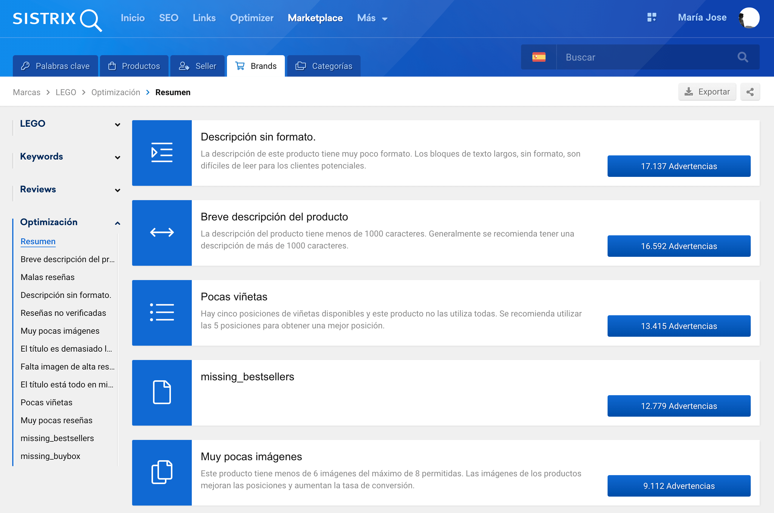 Para que no pierdas la visión de conjunto, SISTRIX comprueba que todos los productos analizados cumplen las reglas básicas de optimización, marcando los errores. De este modo, puedes optimizar fácilmente tus productos.