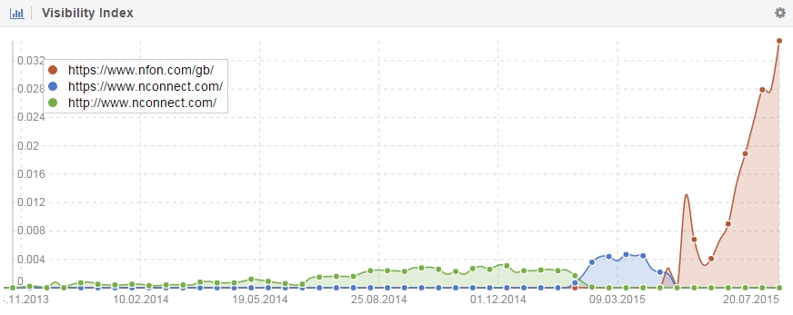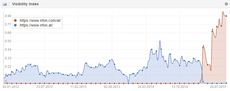 Por ejemplo, el dominio austríaco, nfon.at, se mudó a nfon.com/at/, de este modo registró un 43% más de tráfico en Austria. De todos modos hay que tener en cuenta que al mismo tiempo se llevó a cabo un rediseño de la página Web, por ese motivo no se le puede atribuir indubitablemente el crecimiento del tráfico al cambio del TLD. Eoghan nos muestra en su Blog el crecimiento de la visibilidad en Google: